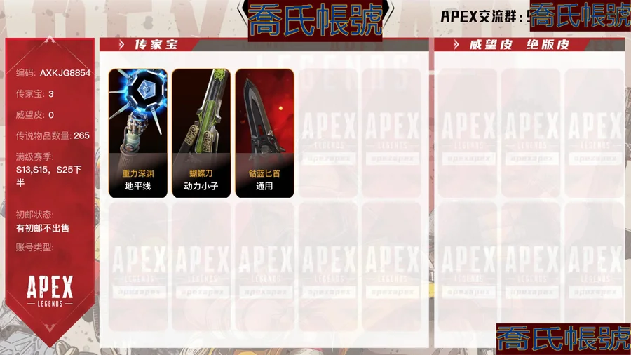 【OBAXKJG885442】3傳家寶 265金, 1500金幣,賽季滿級:S13賽季,S15賽季,S25下半賽季;傳家寶:地平線-重力深淵,動力小子-蝴蝶刀,通用-鈷藍匕首,GK6690/3傳/【鈷藍匕首】地平線重力深淵/動力小子蝴蝶刀/265金皮/【排位】1大師/4鑽石徽章/13/15賽季滿通/25下賽季滿【槍皮】黑曜石之夜/啟示錄/榮光之子/紫水晶的冷漠/粉碎核心/秘法幾何/外域雪崩/虛空接觸/飛龍誕生/極地校準/漩渦核心/嚴冬之魂/舷外超速/瘋狂頻率/賞金獵人時髦獨特/寡婦之翼/宇宙大炮/小飛俠/白金神盾/廢棄者/黃銅猛獸/神聖之心/桃子奶油/超級明星/【皮膚】卡特里娜/郵購怪物/戰術火炮/非法科技/虎鉗夾口/病原體/不死之身/過載/漂浮者/深淵棲息者/幸運與青睞/無限野蠻/科技擁護者/蒼藍之右/時尚前沿/風流男子/陰暗面/生命體徵/無畏墜落/骷髏鑰匙/複合重生/皇家黑曜石/實地研究/閃電之魂/狡猾君主/月光優雅【詳情看截圖】