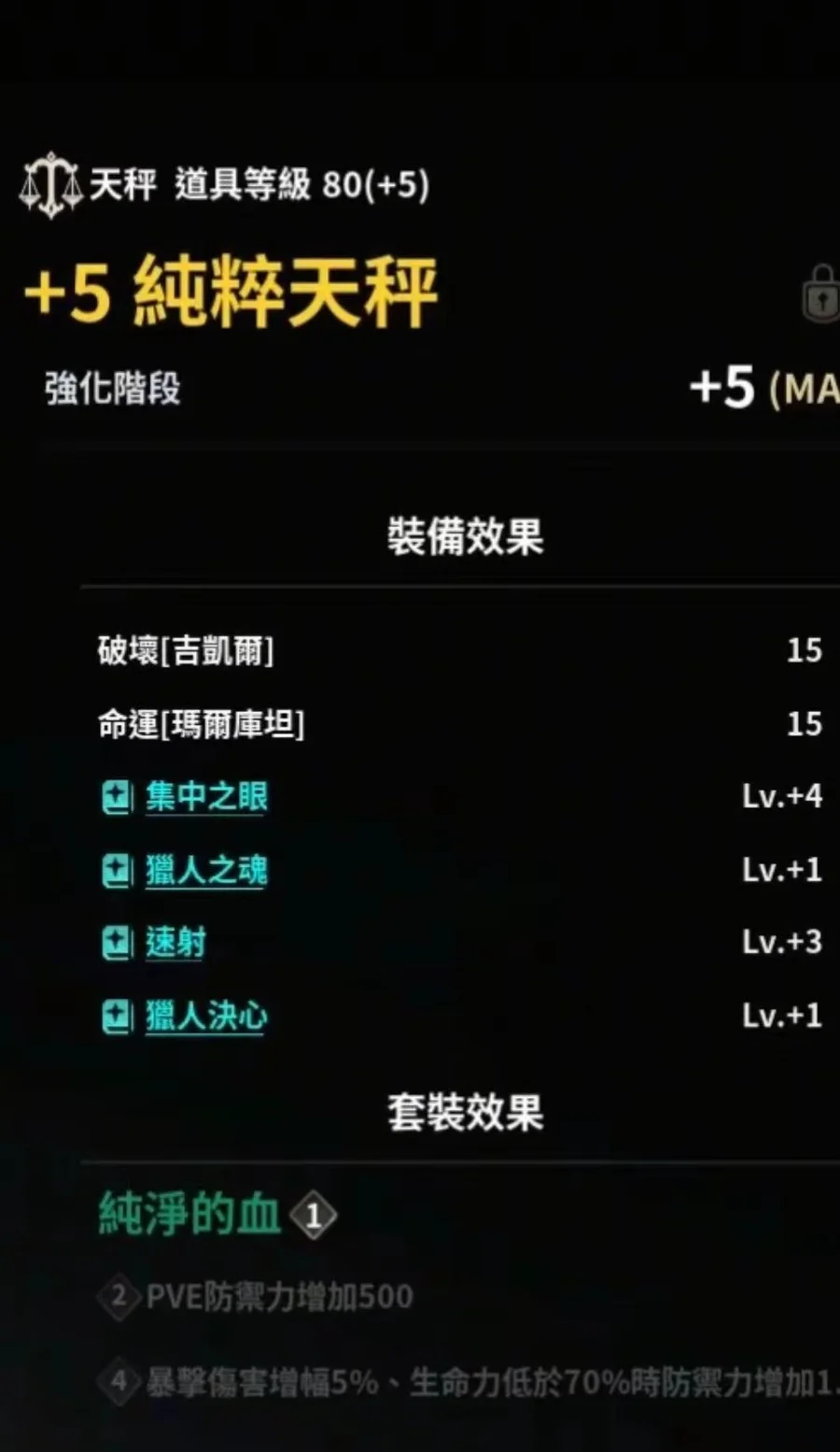 PVP裝備提供的PVP增幅和耐性,現階段是非常誇張的。如果您現在有一套十夫長套裝,基本上到深淵能見誰砍誰,如果您喜愛PVP內容,這個是必備的