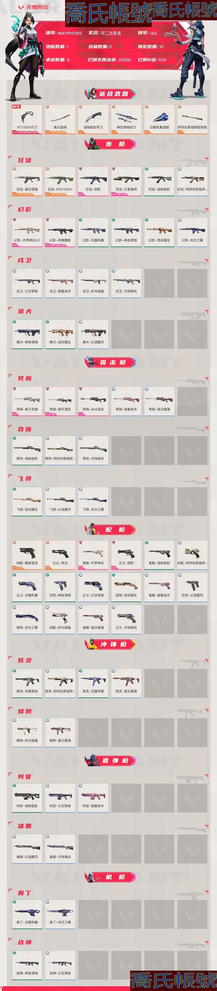 【OBWAYPH135242】Lv129|鉑金I, 刀皮數量6,槍皮數量61(絕版1限定10終極0卓越9);皮膚資產價值25530,已用R點1010;【刀皮】:近戰武器-VCT2025爪刀,近戰武器-鬼丸國綱,近戰武器-詭秘蛇影軍刀,近戰武器-神聖領域戰刀,近戰武器-日耀風暴遺器,近戰武器-阿特拉斯指揮部甩棍; 【槍皮】:標配-黯夜怪談,正義-奇點,狂徒-虛空遺器,狂徒-RGX11zPro,鬼魅-天界神兵,正義-掠影,狂徒-掠影,狂徒-日冕雄師,幻影-天界神兵2.0,幻影-異鱗魔蛇,冥駒-離子武器,冥駒-墮天遺武,冥駒-冰點凝凍,鬼魅-詭秘蛇影,駭靈-無限競技,判官-詭秘蛇影,狂徒-詭秘蛇影,莽俠-詭秘蛇影,狂徒-阿特拉斯指揮部,幻影-日耀風暴,幻影-神聖領域,獠犬-神聖領域,莽俠-阿特拉斯指揮部,正義-日耀風暴,標配-阿特拉斯指揮部,狂怒-神聖領域,駭靈-阿特拉斯指揮部,駭靈-日耀風暴,奧丁-日耀風暴,戰神-神聖領域,幻影-悠閒貓生,幻影-末日之翼,戍衛-太空穿梭,戍衛-甜蜜戰術,戍衛-折光稜晶,戍衛-月球哨兵,獠犬-悠閒貓生,獠犬-幻語魔咒,冥駒-甜蜜戰術,冥駒-星雲暗湧,莽俠-月球哨兵,飛將-悠閒貓生,飛將-幻語魔咒,飛將-末日之翼,正義-太空穿梭,正義-月球哨兵,鬼魅-甜蜜戰術,鬼魅-星雲暗湧,標配-折光稜晶,短炮-悠閒貓生,短炮-末日之翼,狂怒-幻語魔咒,駭靈-星雲暗湧,蜂刺-折光稜晶,蜂刺-星雲暗湧,判官-太空穿梭,判官-甜蜜戰術,雄鹿-幻語魔咒,雄鹿-月球哨兵,奧丁-末日之翼,戰神-太空穿梭;【熱門卡面】:情人節獵梟卡面,勢不可擋捷風卡面,勢不可擋賢者卡面,勢不可擋蝰蛇卡面,勢不可擋芮娜卡面,勢不可擋星礈卡面,VCT2025CN聯賽卡面,VCT2025太平洋聯賽卡面,VCT2025美洲聯賽卡面,VCT2025EMEA聯賽卡面,雙城之戰金克絲卡面;【熱門掛飾】:薰衣草之心掛飾,飛刀掛飾,雙城之戰魄羅掛飾,神中神掛飾,VCT2025CN聯賽掛飾,VCT2025太平洋聯賽掛飾,VCT2025EMEA聯賽掛飾,VCT2025美洲聯賽掛飾,袖珍捷風掛飾;【熱門噴漆】:捷風噴漆,捷風跳PEEK噴漆,真煩人噴漆,進擊的章魚2噴漆,買裝還是存錢噴漆,戰術小夥伴噴漆;【皮膚可能含有某些特權皮膚,具體以遊戲內實際擁有為準】異鱗幻影 奇點正義 冰點冥駒 日曜遺器 顯示卡狂徒 天界鬼魅 掠奪狂徒 詭秘軍刀 天界幻影 鬼丸國綱 虛空狂徒 掠奪正義 神聖戰刀 黯夜標配 vct爪刀 日冕狂徒 離子冥駒 庫存:25530 剩餘VP:96剩餘R點:860段位:黃金3