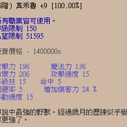 如圖本賣場為【+9滿%真米魯1隻】新手練功好用神寵,+9滿%亦能直接拚進化!現在下標只要﹩100 免手續費!道具皆自用已久,若確定因本道具被鎖包賠,請安心購買。「單在物在」喜歡可直接下標,並私訊確認交易時間。交易地點「卡蕾兒2s獅子城小銀後」或「飛躍廣場2s門口」。有問題歡迎「提問」或「私訊」,感謝您的下標和配合!