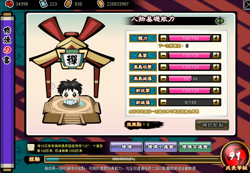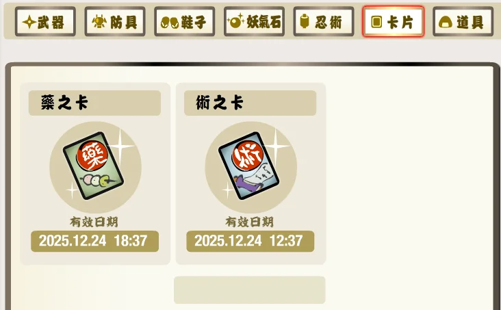 331等夜遊神、修煉91等、還有忍幣835、雙卡12/24到期,武者之石720小時還沒領,還有一小部分服飾沒有貼到。