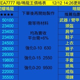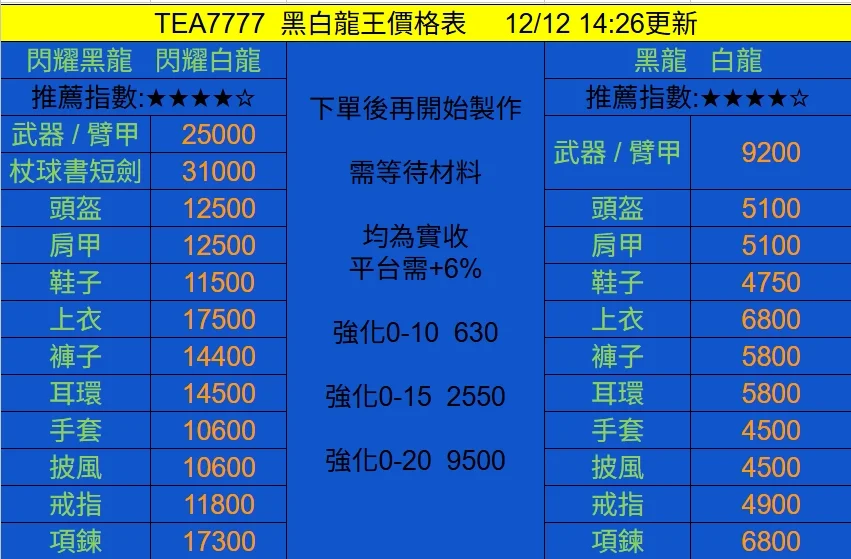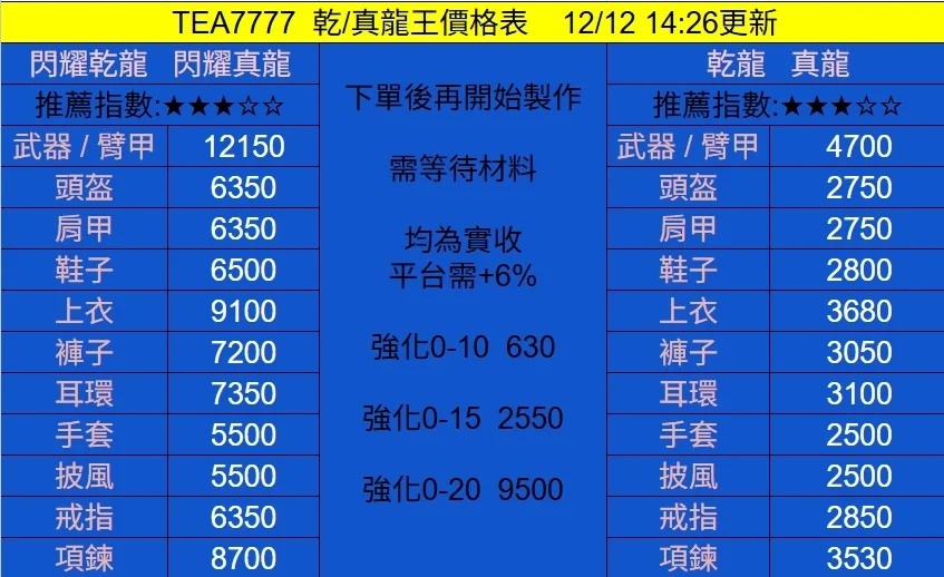 12/12 本日價格 均為實收需+6%平台手續