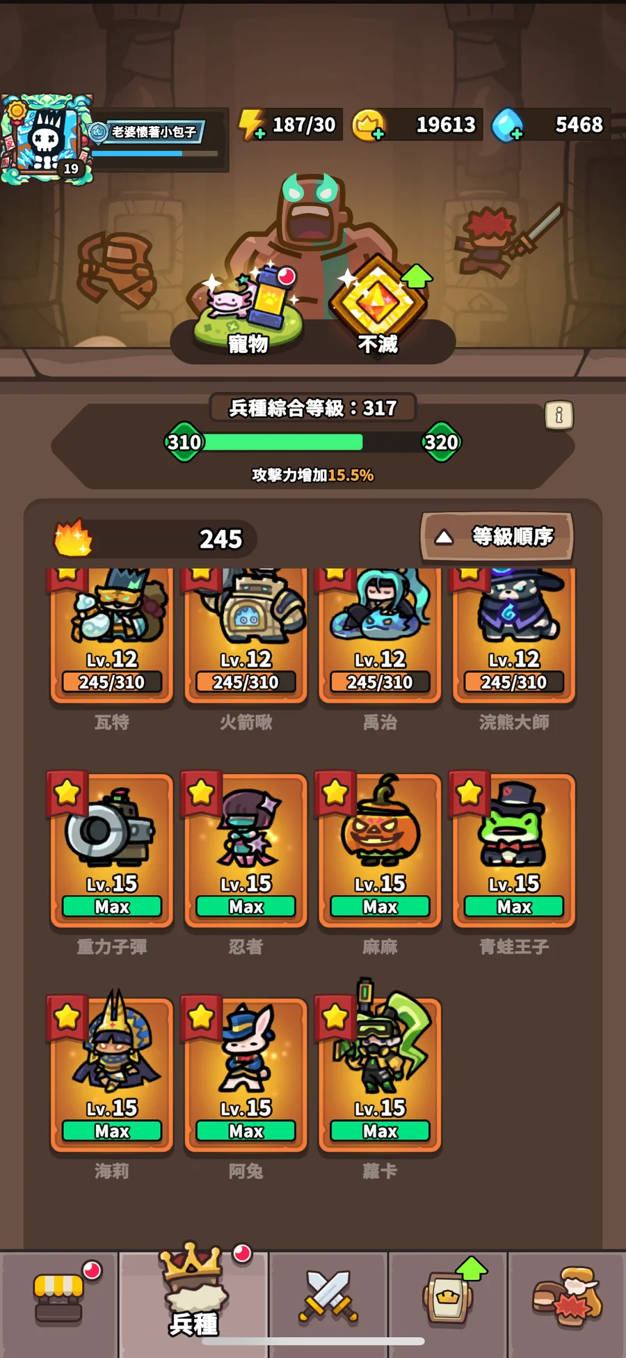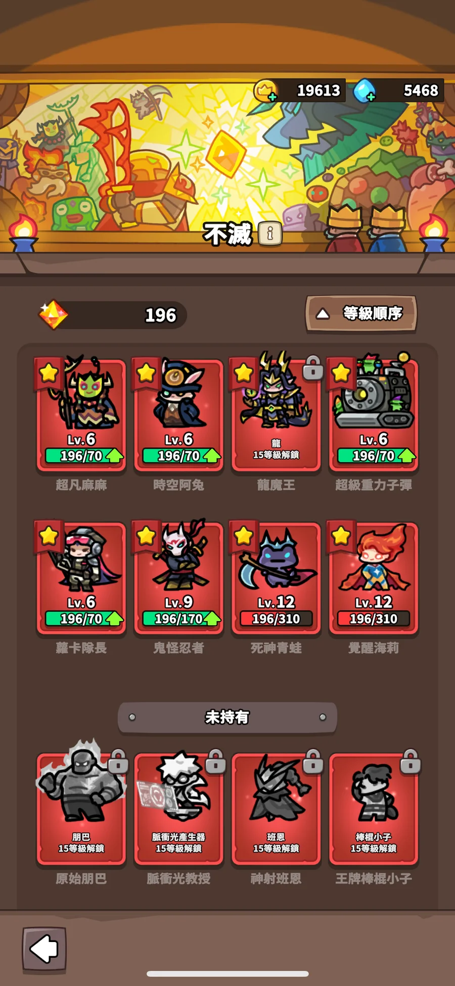 不滅:重力子彈LV6 阿兔LV6 麻麻LV6 蘿卡LV6 忍者LV9 青蛙LV12 海莉LV12 龍(升到15等直接可以開LV6 不用鑽石 之前用重置卷開過目前神話等級10)持續更新⚠️