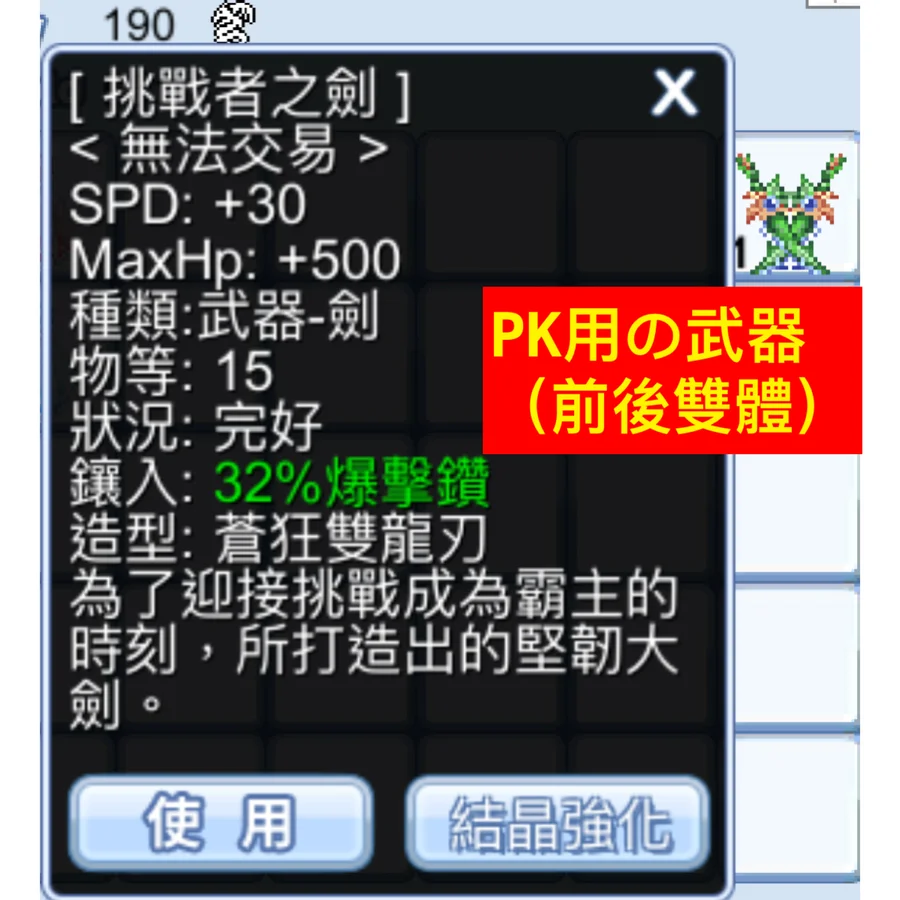 武器:焰紅槍盾ATK+90,結晶+96