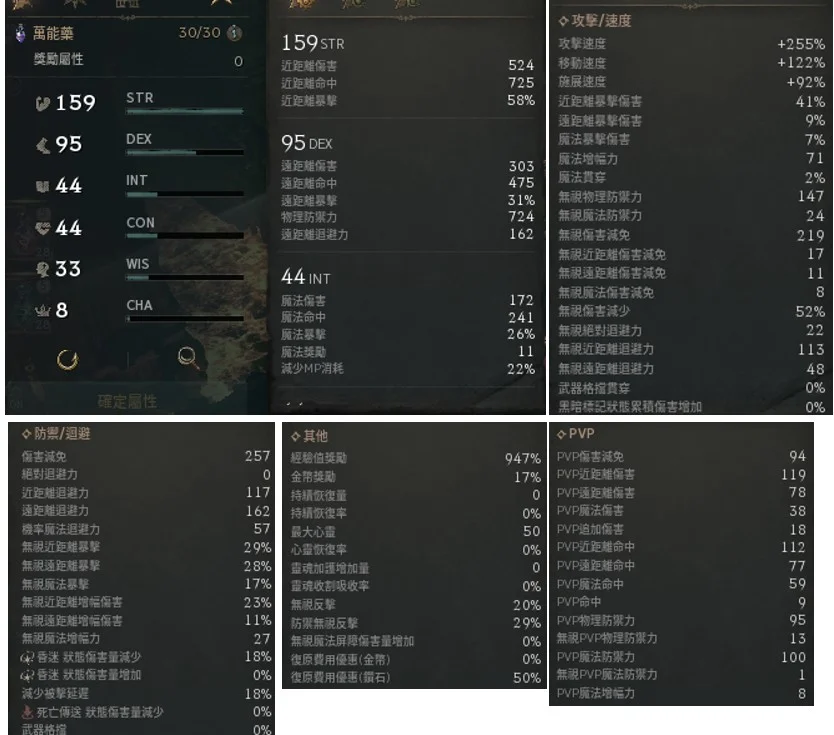 【素質】:等級89.02%、血量62,540、攻/命:524/725、防/魔防:724/565、減傷/PVP減傷:257/94、暈命/抗暈:80/172%、攻速255%
