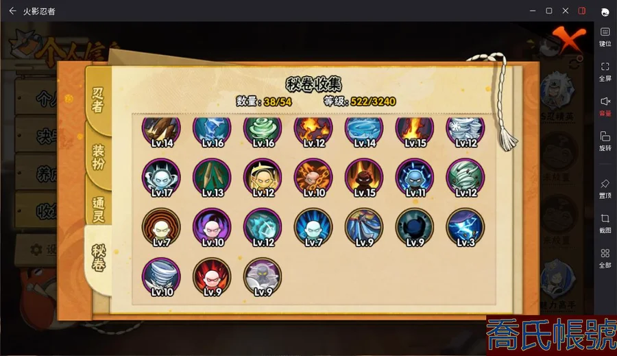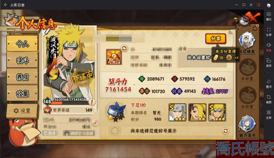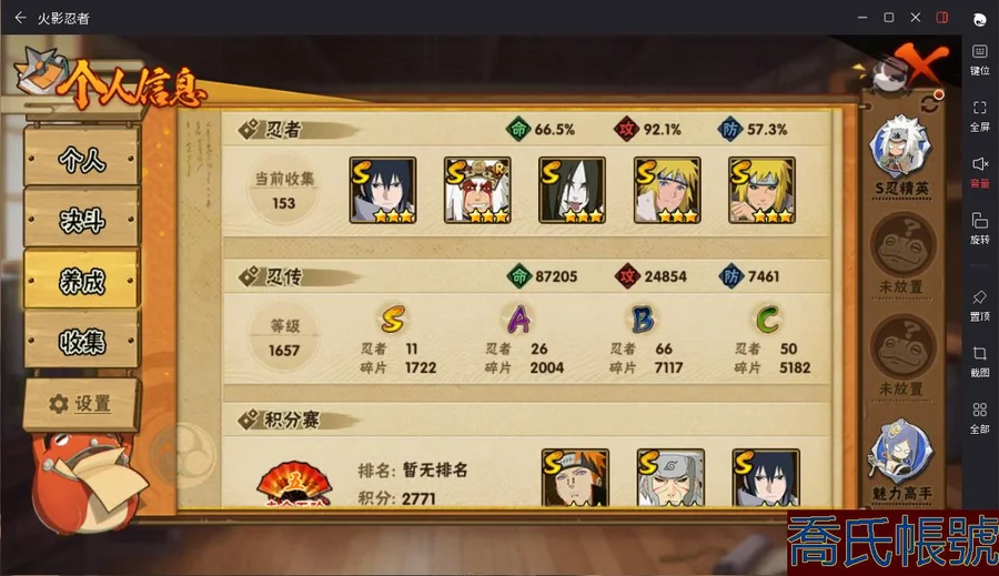 【OBHAWYM367042】VIPV10級;S忍11個;A忍26個;通靈獸17個;S忍:天道佩恩,穢土轉生千手扉間,穢土轉生千手柱間,永恆萬花筒宇智波佐助,舞之豪傑自來也,穢土轉生波風水門,須佐能乎宇智波鼬,穢土轉生長門,大蛇丸,波風水門,千手扉間;A忍:幻之真容旗木卡卡西,忍界大戰日向寧次,四代目土影黑土,穢土轉生迪達拉,忍界大戰奇拉比,青年波風水門,青年艾,近松十人衛千代,須佐能乎宇智波佐助,九尾查克拉漩渦鳴人,百豪春野櫻,忍界大戰秋道丁次,萬花筒寫輪眼宇智波佐助,五代目水影照美冥,死司憑血飛段,疾風傳我愛羅,仙人模式漩渦鳴人,萬花筒寫輪眼旗木卡卡西,宇智波泉奈,宇智波止水,奇拉比,飛段,邁特凱,幹柿鬼鮫,蠍,猿飛阿斯瑪;永久通靈獸:砂之守鶴,藍蛇,蛤蟆吉,忍龜,鐮鼬,猿魔,山椒魚,蜃,蛤蟆仙人,蛤蟆健,蛤蟆龍,蛤蟆廣,夢貘,蛞蝓,忍犬,鮫鯊,烏鴉;v10/死水/紫狗/穢土長門/穢土柱間/穢土扉間/扉間/11s/