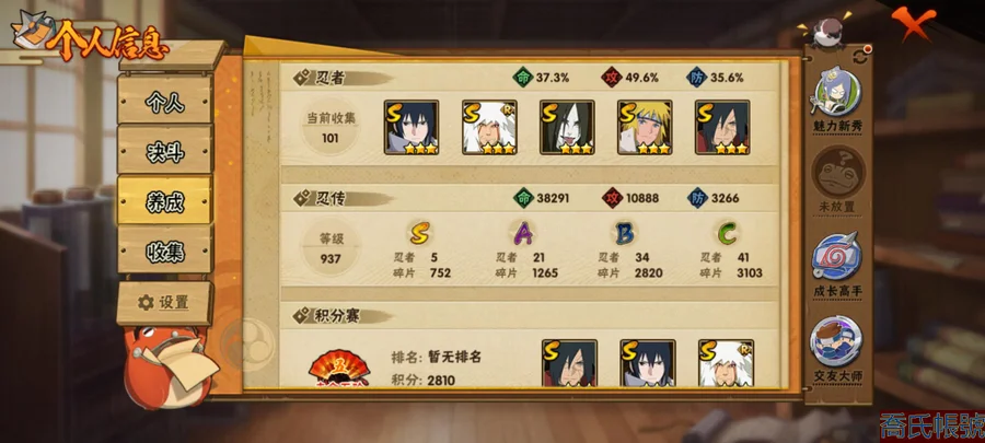 【OBHAWYM859242】VIPV8級;S忍5個;A忍21個;通靈獸13個;S忍:永恆萬花筒宇智波佐助,舞之豪傑自來也,穢土轉生解宇智波斑,大蛇丸,波風水門;A忍:漂泊浪客佩恩六道,忍界大戰日向寧次,穢土轉生迪達拉,青年艾,近松十人衛千代,須佐能乎宇智波佐助,九尾查克拉漩渦鳴人,新春限定小南,曉大蛇丸,新春限定波風水門,萬花筒寫輪眼宇智波佐助,死司憑血飛段,疾風傳我愛羅,仙人模式漩渦鳴人,六代目水影長十郎,迪達拉,飛段,邁特凱,幹柿鬼鮫,蠍,猿飛阿斯瑪;永久通靈獸:砂之守鶴,藍蛇,蛤蟆吉,忍龜,鐮鼬,猿魔,山椒魚,蜃,蛤蟆仙人,蛤蟆健,忍犬,鮫鯊,烏鴉;v8/紫狗/解斑/5s/3直購a