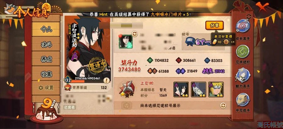 【OBHAWYM389842】戰鬥力:3700000萬;VIPV10級;S忍3個;A忍12個;通靈獸15個;S忍:天道佩恩,舞之豪傑自來也,波風水門;A忍:俠隱江湖宇智波佐助,俠隱江湖藥師兜,青年波風水門,穢土轉生迪達拉,飛段,邁特凱,蠍,幹柿鬼鮫,猿飛阿斯瑪,不動,羈絆神農,初始形態機械鳴人;永久通靈獸:蛞蝓,忍犬,忍龜,山椒魚,猿魔,蛤蟆吉,藍蛇,鐮鼬,砂之守鶴,蜃,蛤蟆仙人,蛤蟆健,烏鴉,鷹,鮫鯊普通;【極•影舞葉】有很多遊戲是這一個號少說5款多說10款都充過錢買了就是一個字直