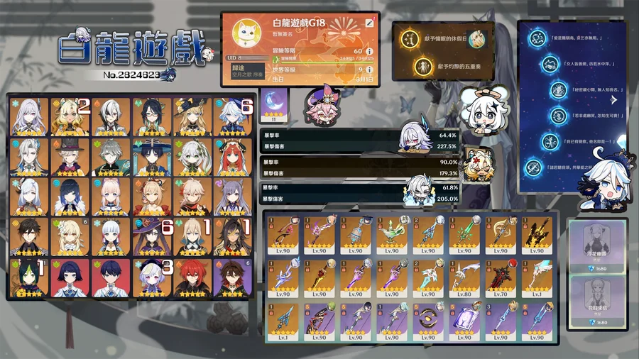 【女、60等、43金角、19金武】G18_水神6+0絲柯克0+1草神0+1希諾寧僕人妮露夜蘭萬葉那維萊特海森閒雲