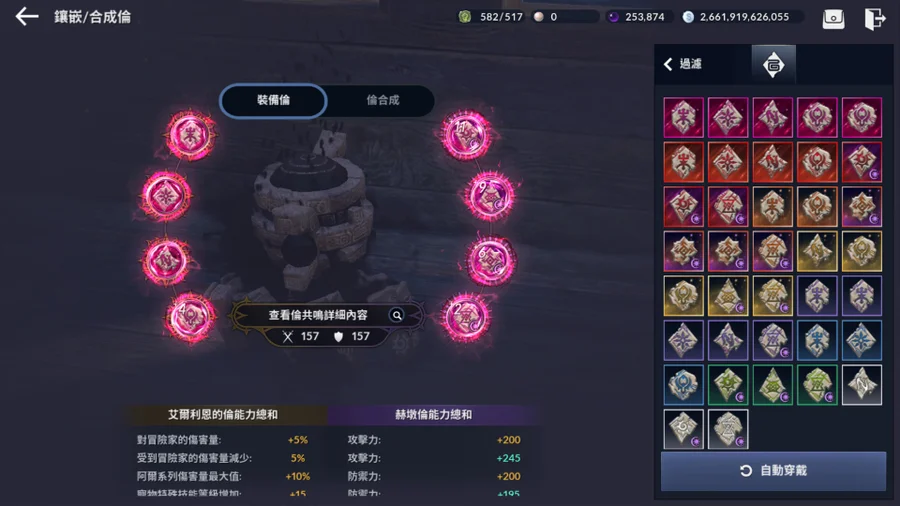 ●主角色武防裝備--- +8混沌主武器 / +8黎明輔助武器 / +8黎明頭盔 / +8黎明盔甲 / +8黎明鞋子 / +8黎明手套(全太古記憶刻印 / 全鑲滿嵌混沌水晶x30 / 全魔力刻印滿,全+100攻擊/+100防禦_頂),+8空虛項鍊(已覺醒) / +8空虛戒指(已覺醒) / +8空虛耳環(已覺醒) / +8空虛腰帶(已覺醒) / +8空虛手鐲(已覺醒)(全太古記憶刻印 / 全鑲滿精緻的混沌水晶x15 / 各部位飾品之魔力刻印_全+90以上攻擊/+90以上防禦),黑精靈倫(8個以上太古黑精靈倫, +11武力之倫 / +9鐵甲之倫 / +6能量之倫 / +2經驗之倫 / +2戰爭之倫 / 意志之倫 / 阿爾之倫 / +4同行之倫 ,套用第15個倫共鳴_頂),+26協調的煉金石(鑲嵌+I 混沌煉金石:突破 & +10混沌煉金石:幸運 & +9混沌煉金石:激烈 & +9混沌煉金石:勇猛,仍保留大量資源給您自由彈性選擇要衝的煉金石),+10空虛拉夫利普文物 & +10空虛阿爾文物(全太古以上紋樣,其中鑲嵌2張太古紋樣刻印書 & 2張燦爛太古紋樣刻印書_頂數值+93攻/+47防 & 1張燦爛的混沌紋樣刻印書_頂數值+133攻/+71防 & 5張混沌紋樣刻印書 ; 系列突破分別為+6/+6),+25空虛的徽章,光源石 (全混沌光源石,四種分別突破數值如圖所示;+14太古光源石=+0混沌光源石;+15太古光源石=+2混沌光源石;+16太古光源石=+4混沌光源石;製作介面可察看轉換,+15以上光源石才建議太古升為混沌,因可開箱取得),+2傳承之環 (混沌等級),+9渾沌的龜裂圖騰 (結合1個+8圖騰、2個+7圖騰),+10夜幕靈魂石/+5月光靈魂石(近期更新的新裝備機制)
