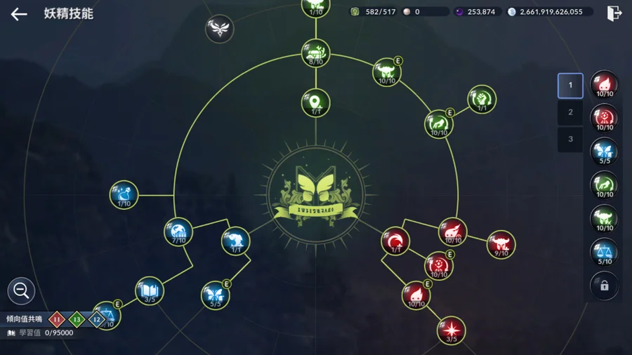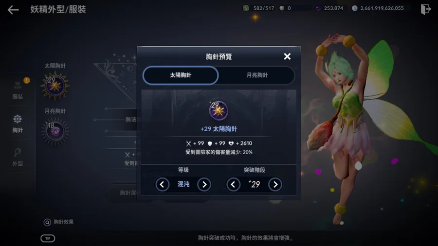 ●妖精-已解鎖 沙漠的痕跡/蛤蜊自動拾取 & 黑石塊祭壇自動奉獻 & 黑暗能量經驗值增加 等...10多種實用技能(多數等級頂),省去手動撿拾/點選 的麻煩,掛大沙漠也讓純水的效益更高些! (太陽胸針為混沌階級以上,如圖)
