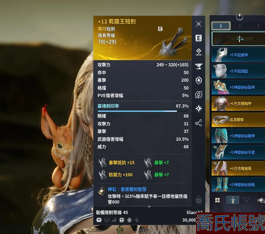 【OBYHVRD494442】【吉凱爾】魔族女殺星,裝等2206,守護力464,戰令會員:微風會員,天加隆會員,世界呼喚通行證,支線進度全滿,封印副本本種族進度全滿,羽毛暫未滿級,寵物:天空鯨魚。隊裡沒T換T玩。PVE每天10小時+滿肝號,+12乾龍王武器 屬性都洗好了。首飾差個耳環其他都是76裝等的。三個質變技能都16級。超越剩8次遠征剩6次。還有800水晶