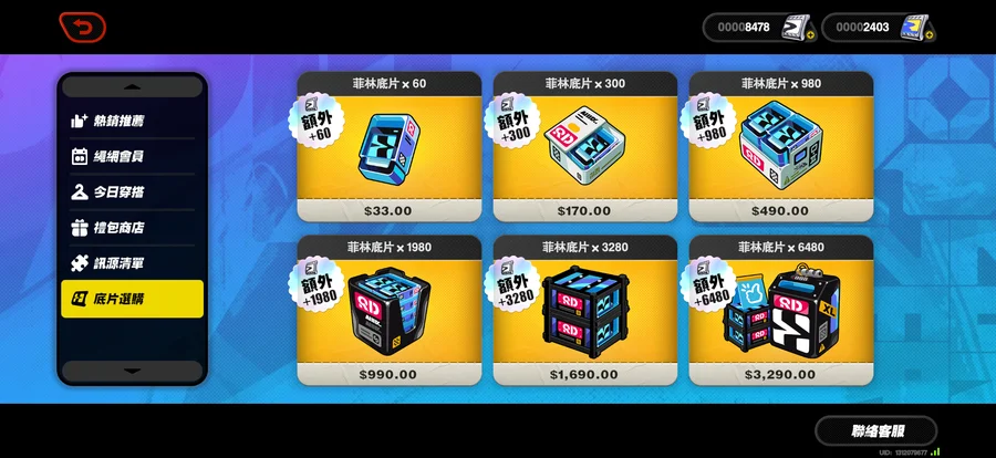帳號內還有8478儲值底片,大約1.3單(台幣約4280元);菲林約3700。大約可換加密約77抽