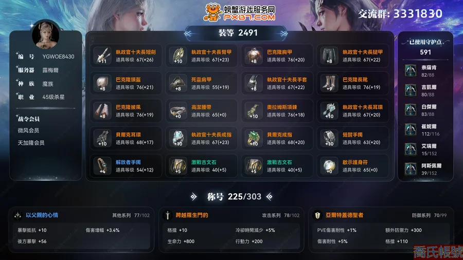 【OBYGWOE843042】【露梅爾】45級魔族女殺星,裝等2491,守護力591,支線進度全滿,封印副本全種族進度全滿,羽毛進度滿級,戰令會員:微風會員,天加隆會員,稱號:以父親的心情,跨越羅生門的,亞爾特蓋德聖者,翅膀:守護者最上級翅膀;2500分心血大號殺星 近2000攻擊力 細節拉滿培養極其用心 17級心臟刺擊+17級暴風亂舞 副本DPS斷檔領先同裝備輸出 沒有人可以在我的爆發裡打敗我 進度:超越6+2200火神殿 肝度內容全收集! 手工製作等級滿級! 倉庫大量材料未清空,買過來直接當究極心血號培養即可 4區PVP環境友好,副本可以跨服,享受舒適的同時不需要排隊 日產出2000萬基納,後續沒時間玩不然不會割愛 希望買家能好好對待