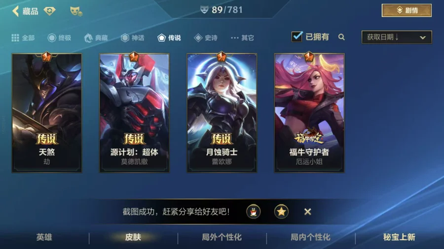 传说皮肤: 福牛守护者厄运小姐,天煞劫,源計劃:超體 莫德凱撒,月蝕騎士蕾歐娜;