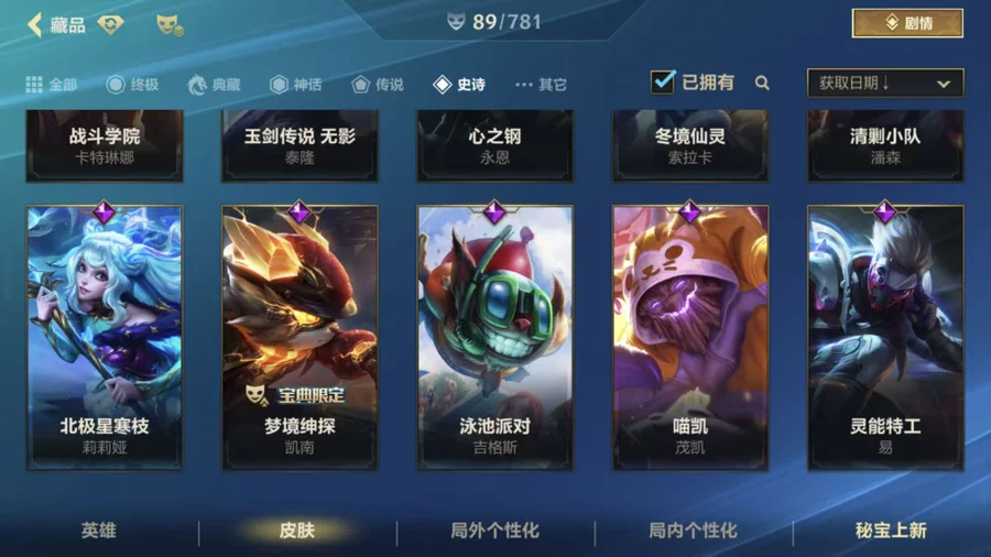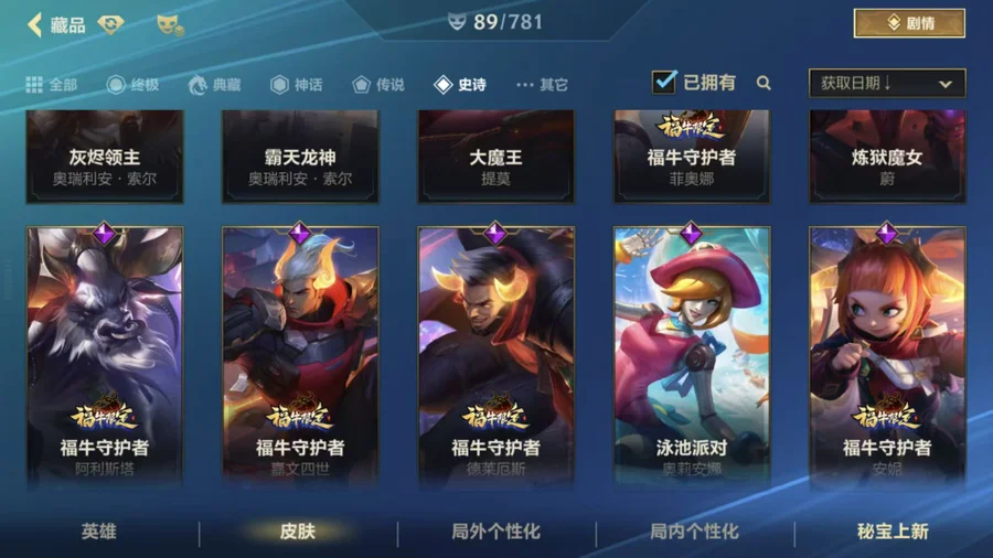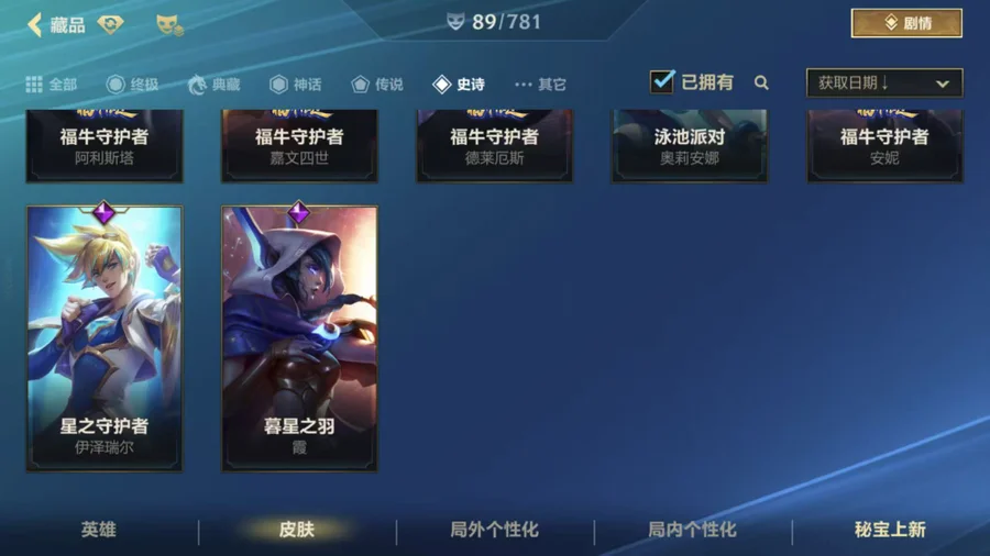 史诗皮肤: 福牛守护者菲奥娜,炼狱魔女蔚,大魔王提莫,星之守护者伊泽瑞尔,福牛守护者德莱厄斯,泳池派对奥莉安娜,弹幕天使卡莎,腥红之月崔斯特,福牛守护者安妮,未来战士锤石,钢铁军团盖伦,暮星之羽霞,星域审判官卡蜜尔,福牛守护者嘉文四世,福牛守护者阿利斯塔