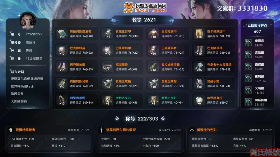 【OBYYIVB292942】【奈薩肯】45級天族女魔道星,裝等2621,守護力607,支線進度全滿,封印副本全種族進度全滿,羽毛進度滿級,戰令會員:伊斯夏爾肯傭兵通行證,世界呼喚通行證,微風會員,天加隆會員,稱號:斐爾特朗聖者,遇見凱西內爾的根源,黃澄澄的光彩,翅膀:守護者最上級翅膀;裝備詞條基本全洗完,森林,古代翅膀馬上齊,穿越卡牌沒打目前進度7