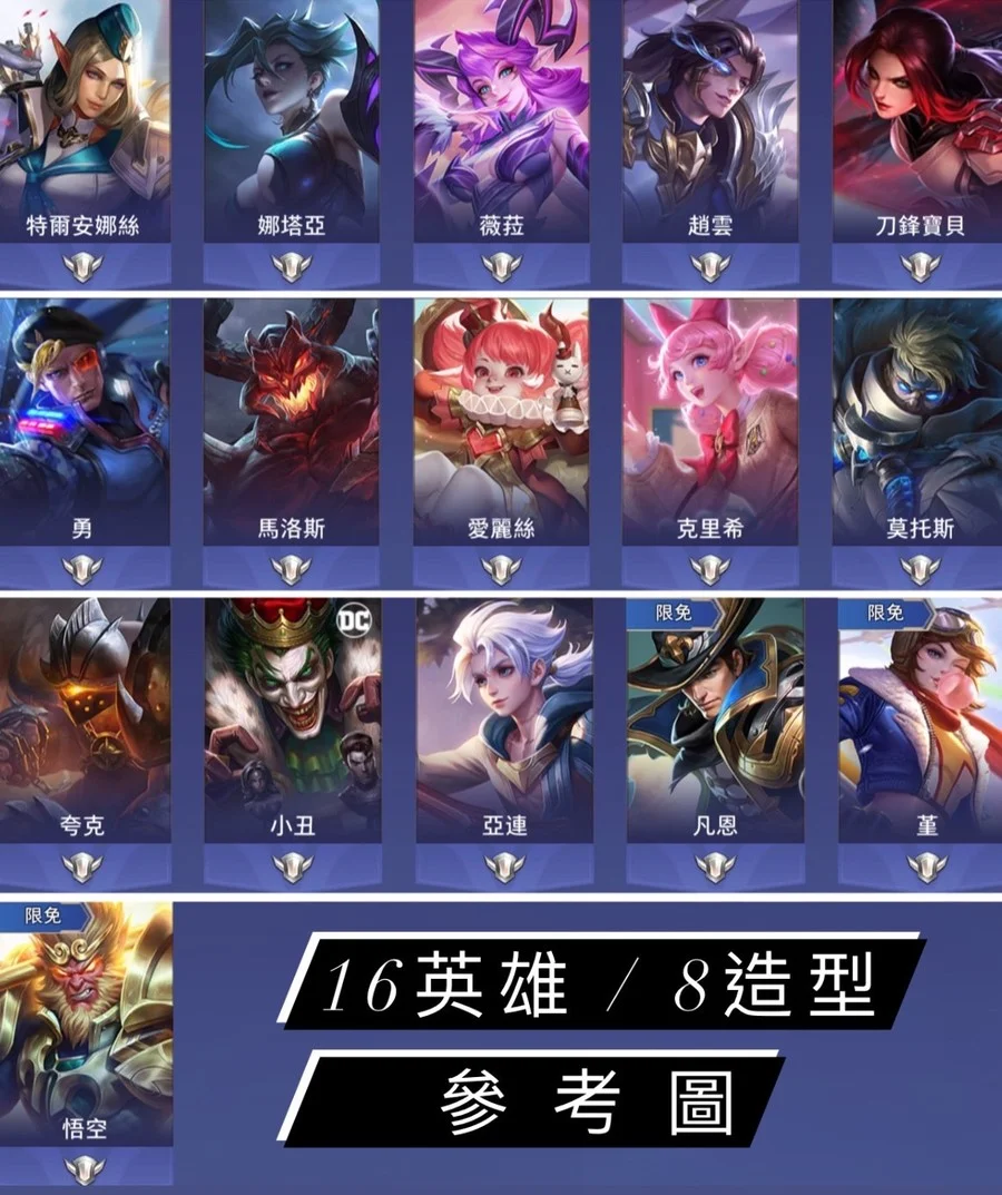凡恩、娜塔亞、薇拉、趙雲、馬洛斯、悟空、夸克、亞連、刀鋒寶貝、勇、愛麗絲、堇、克里希、莫托斯、特爾安娜絲、小丑