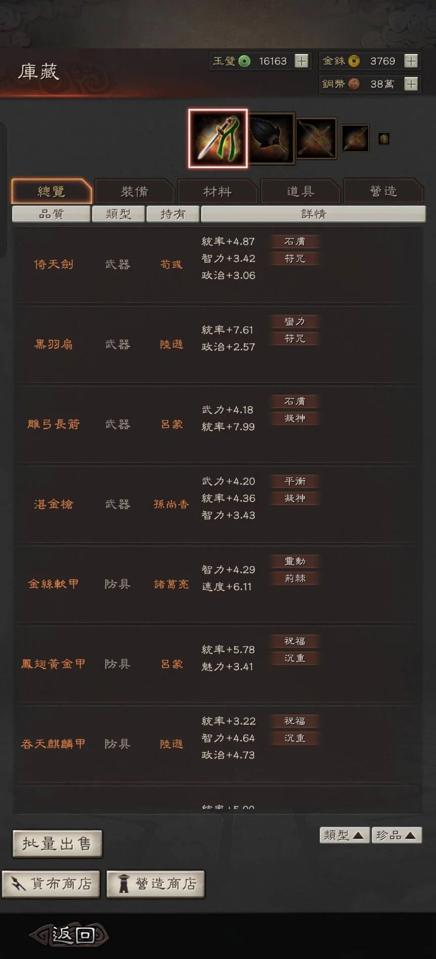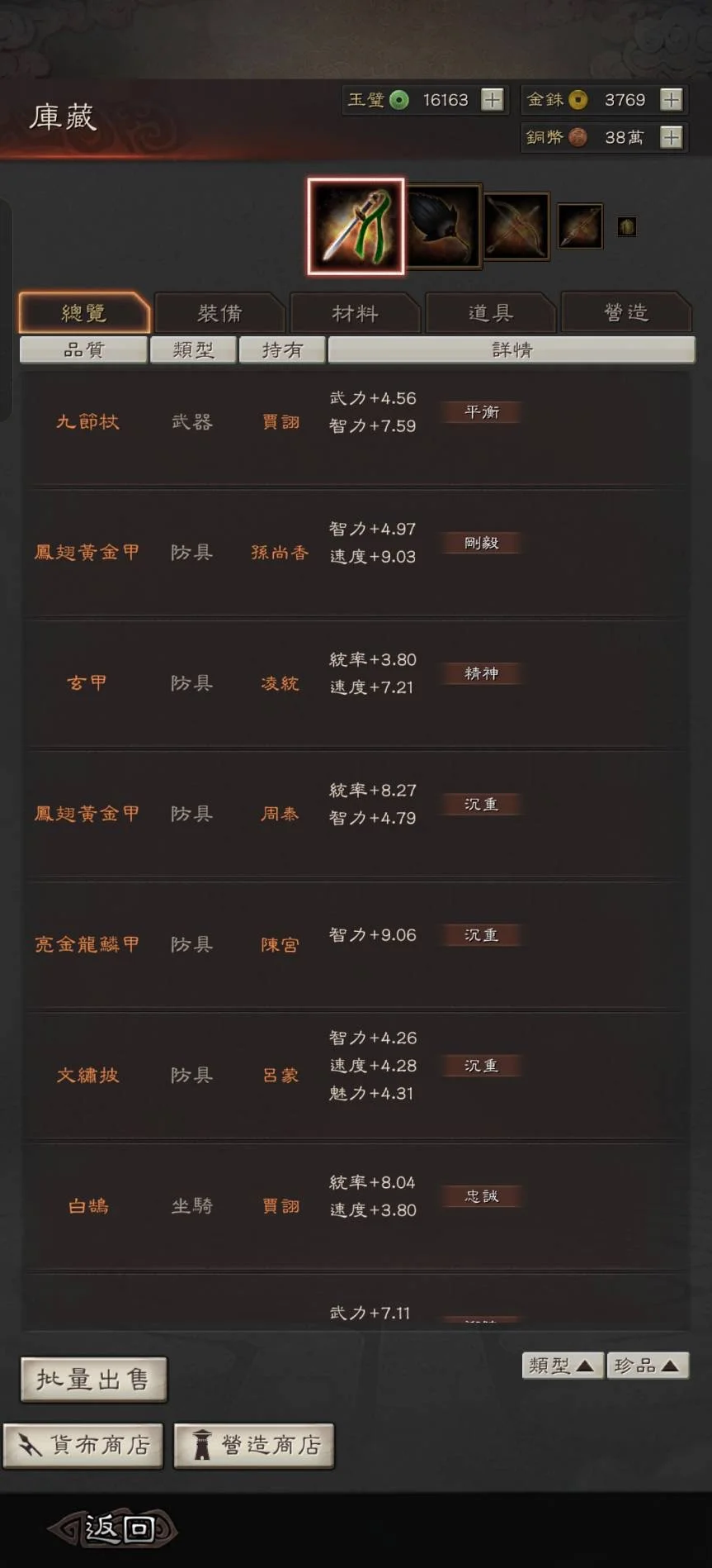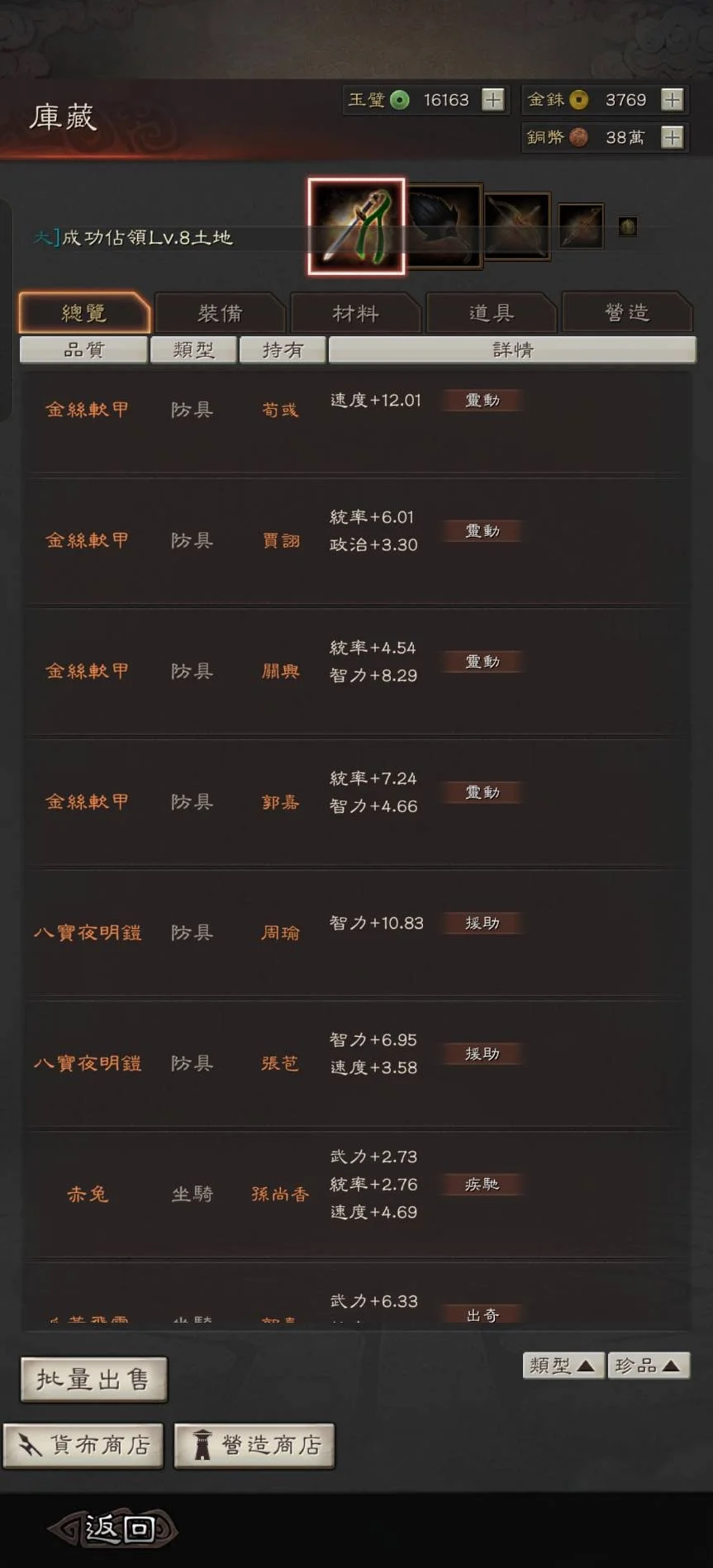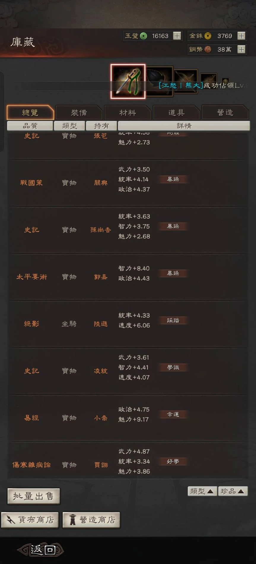寶物豪華:無懼 雄烈 樂奏 龍鑲 虎侍 6靈動 3暴躁 2長建 剛體 2扶危 2出奇 雍雅 雙特技7件 特技無數 殘卷還有23