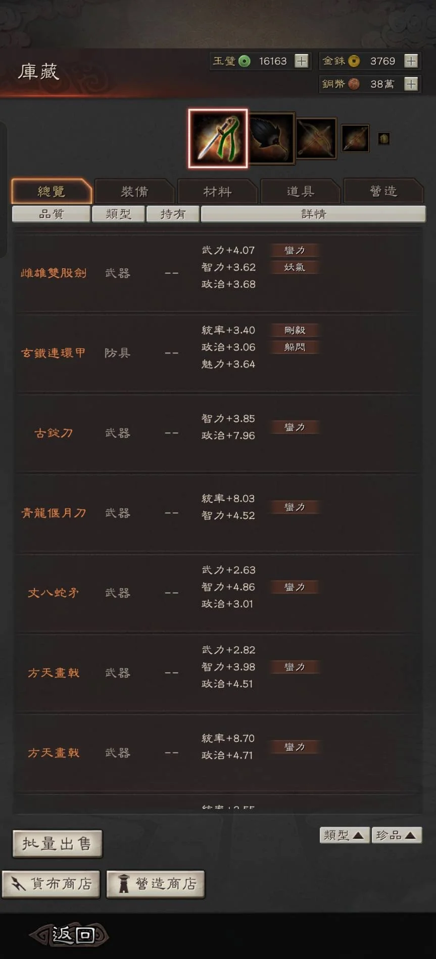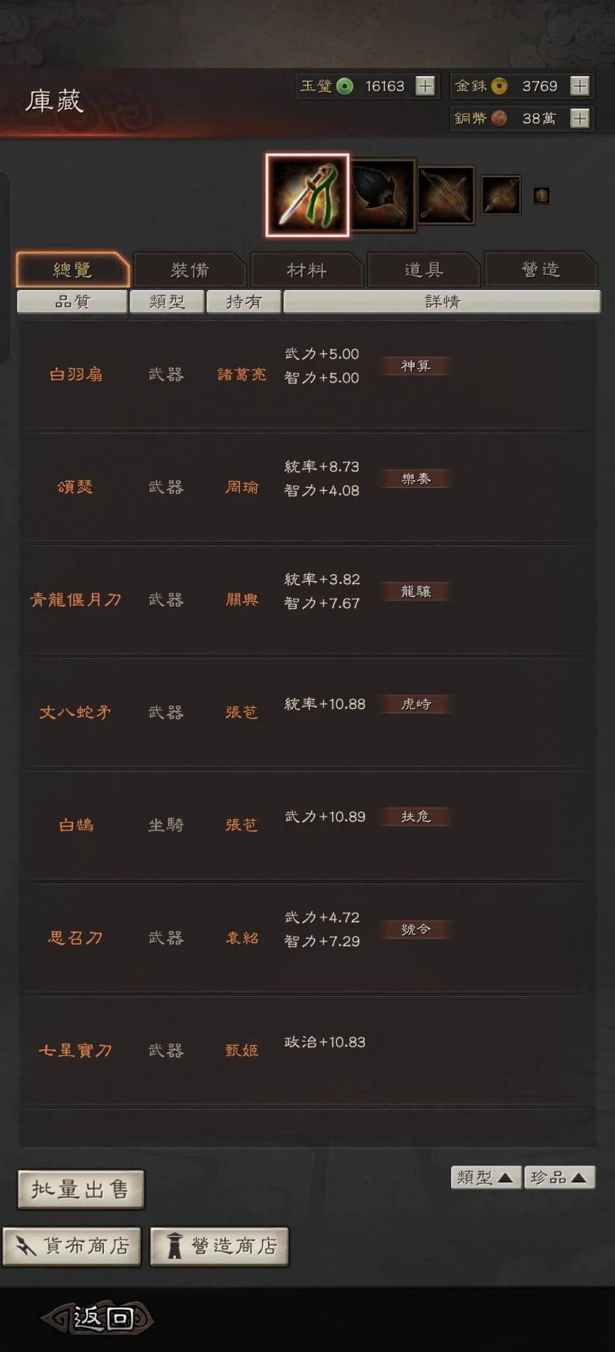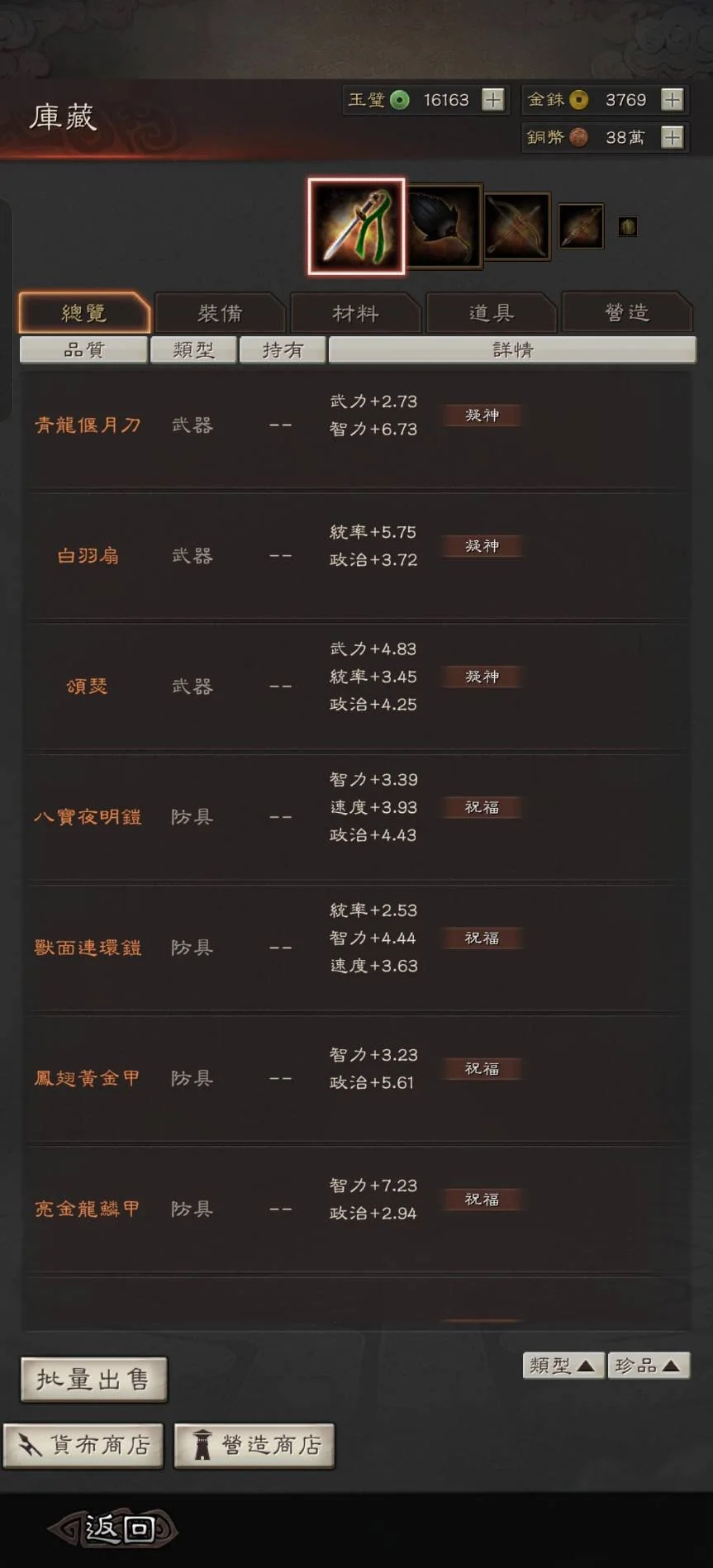 寶物豪華:無懼 雄烈 樂奏 龍鑲 虎侍 6靈動 3暴躁 2長建 剛體 2扶危 2出奇 雍雅 雙特技7件 特技無數 殘卷還有23