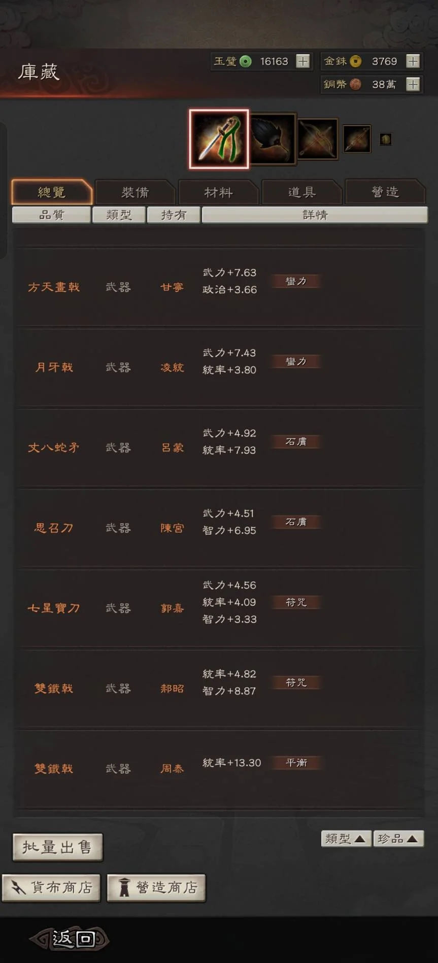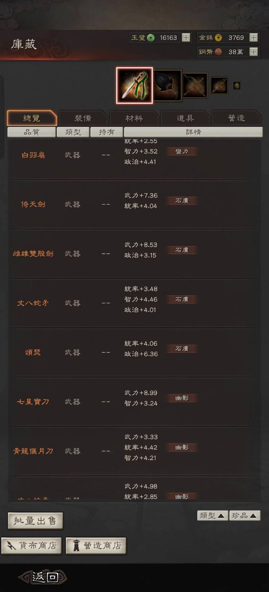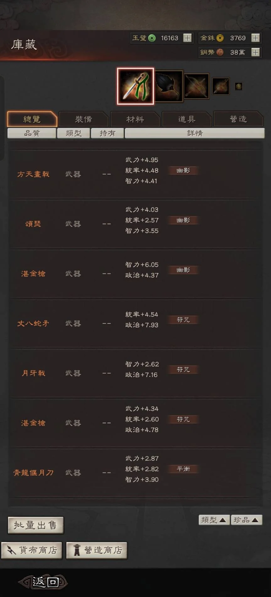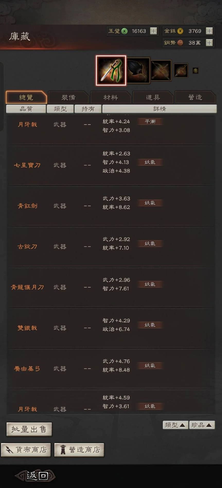 寶物豪華:無懼 雄烈 樂奏 龍鑲 虎侍 6靈動 3暴躁 2長建 剛體 2扶危 2出奇 雍雅 雙特技7件 特技無數 殘卷還有23