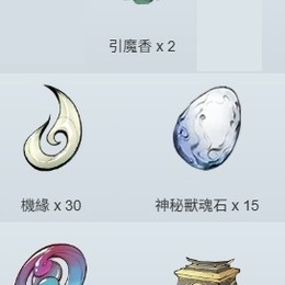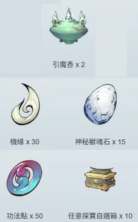 引魔香x2|機緣x30|神秘獸魂石x15|功法點x50|任意探寶自選箱x10序號