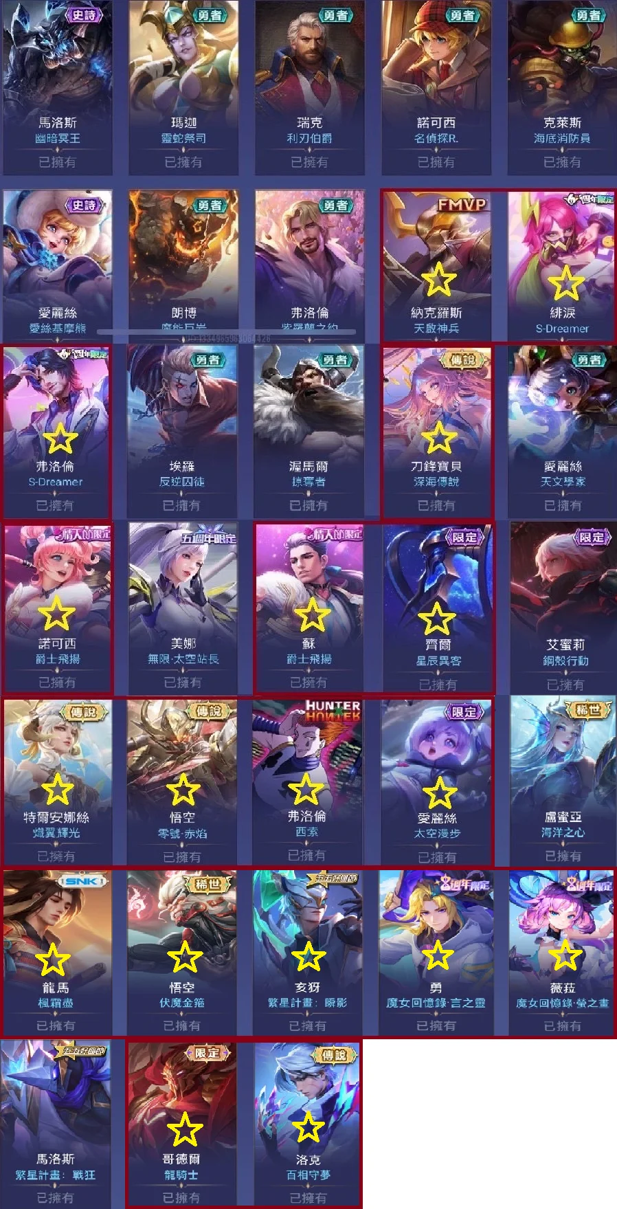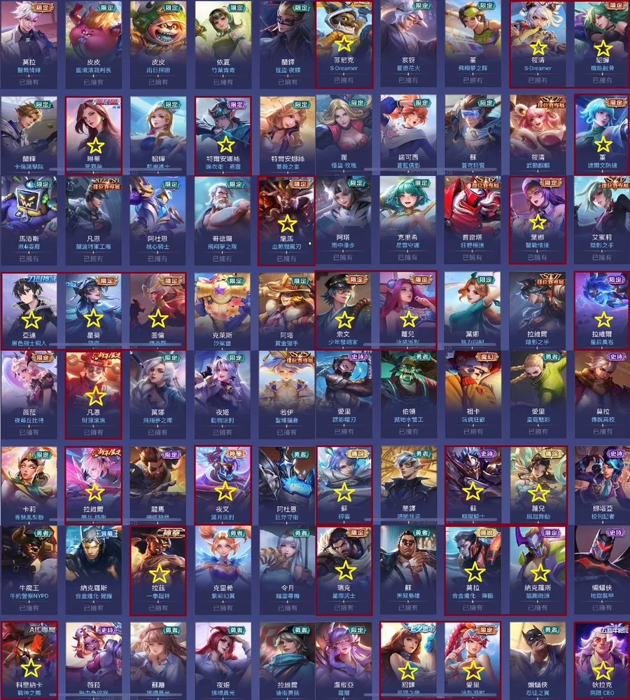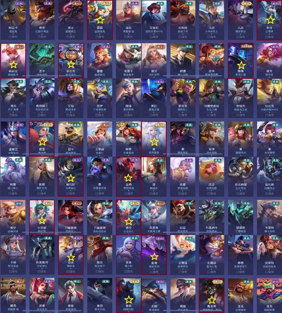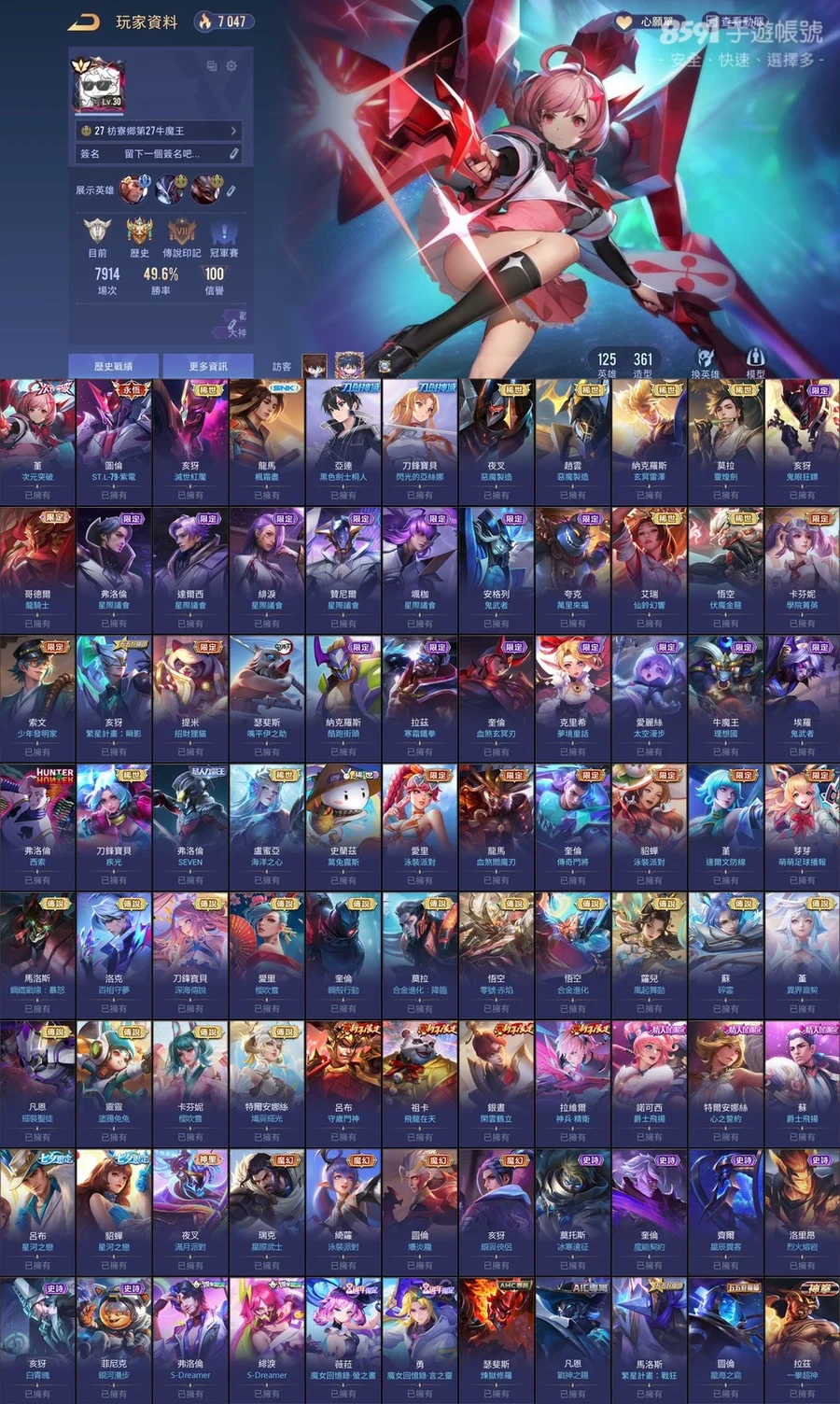 多課金抽獎造型!!全英雄三百多造型!共125英雄361造型!勝率近50%!!共7次S戰場傳說印記!!常用奧義皆已齊全!!