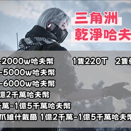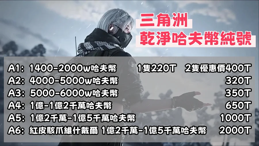 | A1 | 1400-2000w哈夫幣 | 1隻220T / 2隻優惠400T |