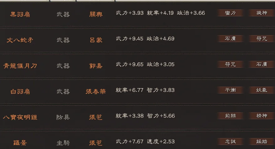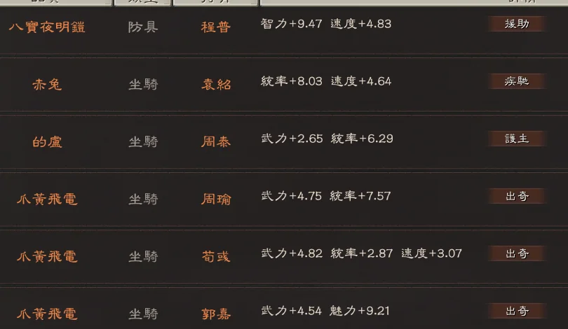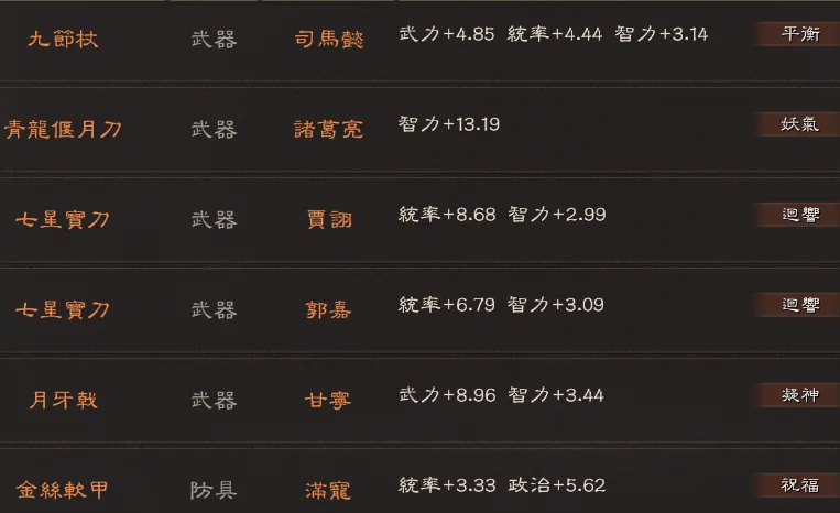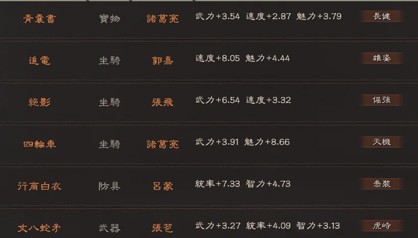 主打典藏滿紅滿特技北伐槍(天機 神算 龍湘 虎峙都有 以及7件雙特技)3匹出奇馬搭配三幻神的富貴騎 10張將作殘卷 寶物方面:2剛體 暴躁 長健 防具:荊棘+精神 4精神 6靈動 2援助 喬裝 灼烈 沉重 坐騎:忠誠+踩踏 3踩踏 3出奇 疾馳 2雄姿 護主 倔強 武器:蠻力+凝神 石膚+符咒 符咒+石膚 平衡+妖氣 2迴響 雄烈 神算 龍湘 虎峙 號令