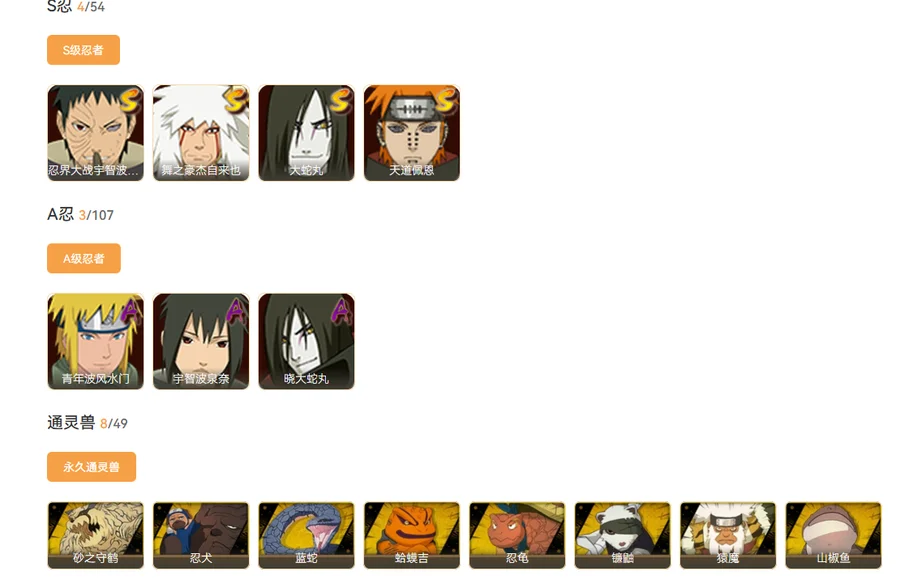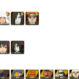 通灵兽:忍犬(普通),蓝蛇,蛤蟆吉,忍龟,镰鼬,砂之守鹤,猿魔,山椒鱼时装:百战佩恩天道,蜀面豪杰舞之豪杰自来也