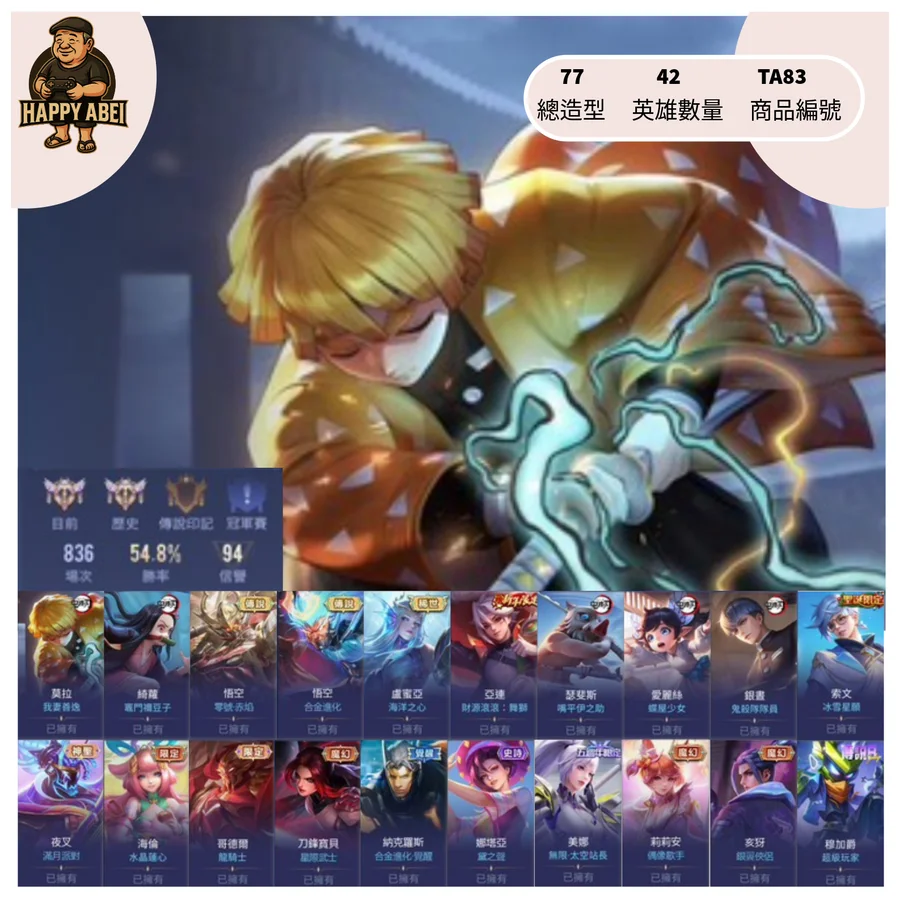 【Garena帳有綁定、青銅、無VIP、42英、77造】[分期/直購]快樂阿北遊戲館~主打莫拉善逸綺蘿禰豆子悟空零號等多聯動造型