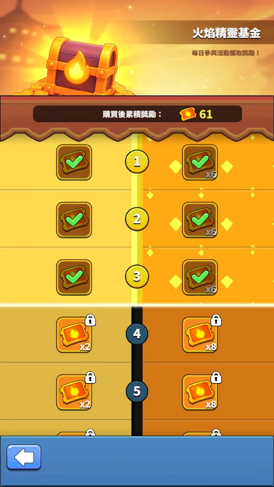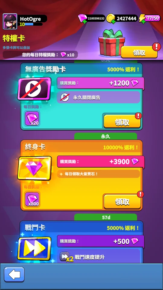 21億鑽 + 21億活動兌換碎片 + 戰鬥卡 + 無廣告獎勵卡 + 離線收益 + 挑戰首領卡 + 終身卡 + 3天豪華禮包 + 賽季通行證 + 每日/每週/每月禮包 + 現有其他通行證 + 現有全禮包 +餘燼之靈禮包 + 火焰精靈基金 = 500
