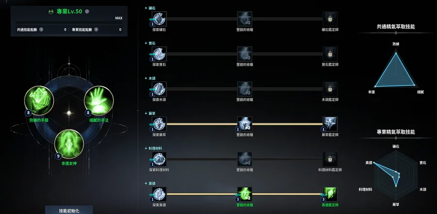 精氣萃取、製作管理(鐵匠、盔甲、手工藝、鍊金、料理)全專業Lv.50滿等