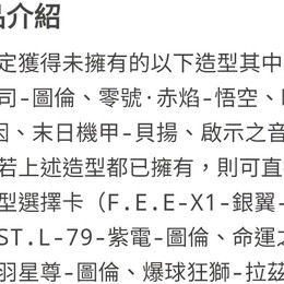 打開必定獲得未擁有的以下造型其中之一:時雨天司-圖倫、零號·赤焰-悟空、暗淵魔法-潘因、末日機甲-貝揚、啟示之音-刀鋒寶貝,若上述造型都已擁有,則可直接獲得永恆造型選擇卡(F.E.E-X1-銀翼-特爾安娜絲、ST.L-79-紫電-圖倫、命運之淵-堇、鶴羽星尊-圖倫、爆球狂獅-拉茲)