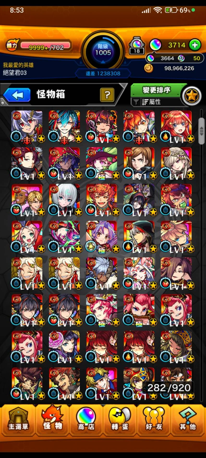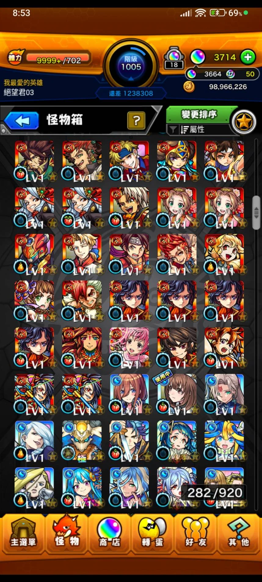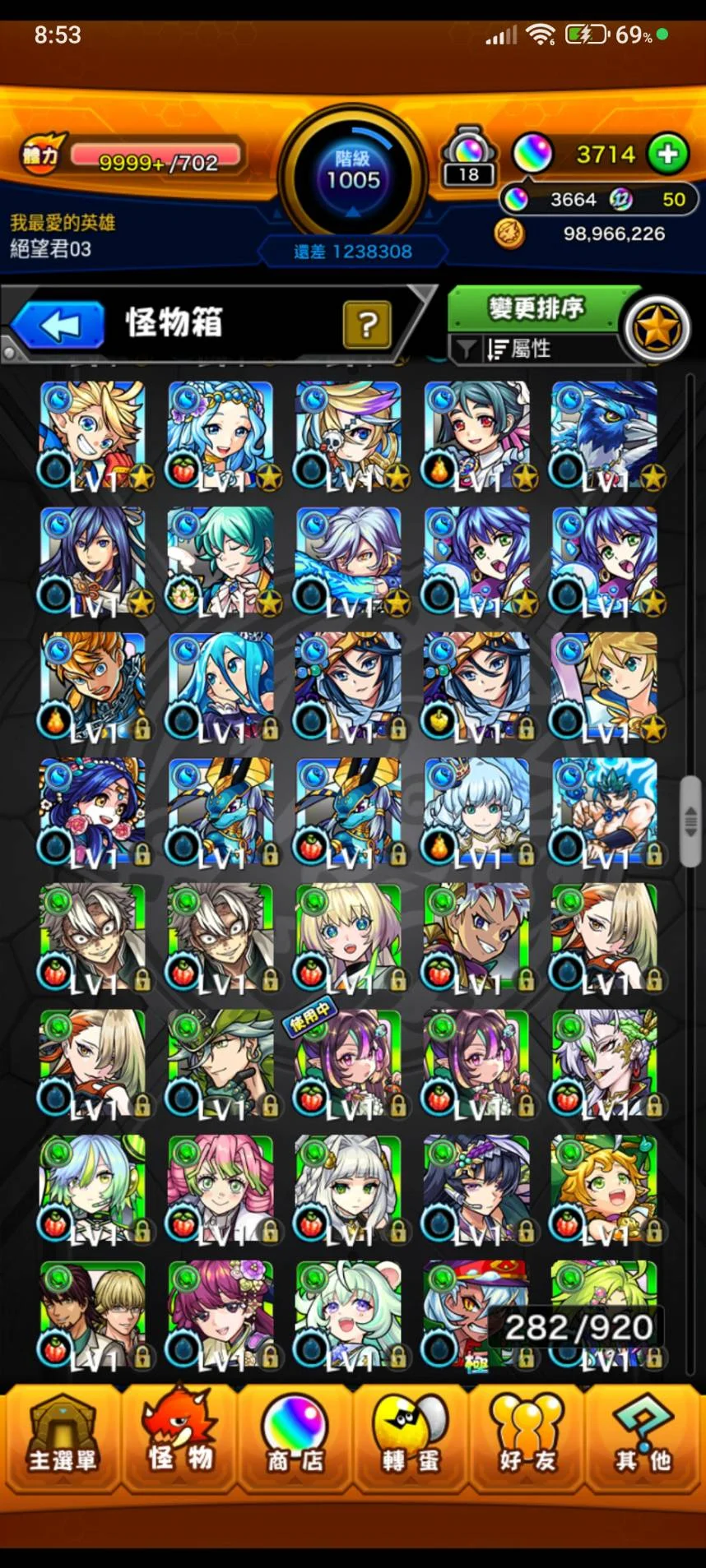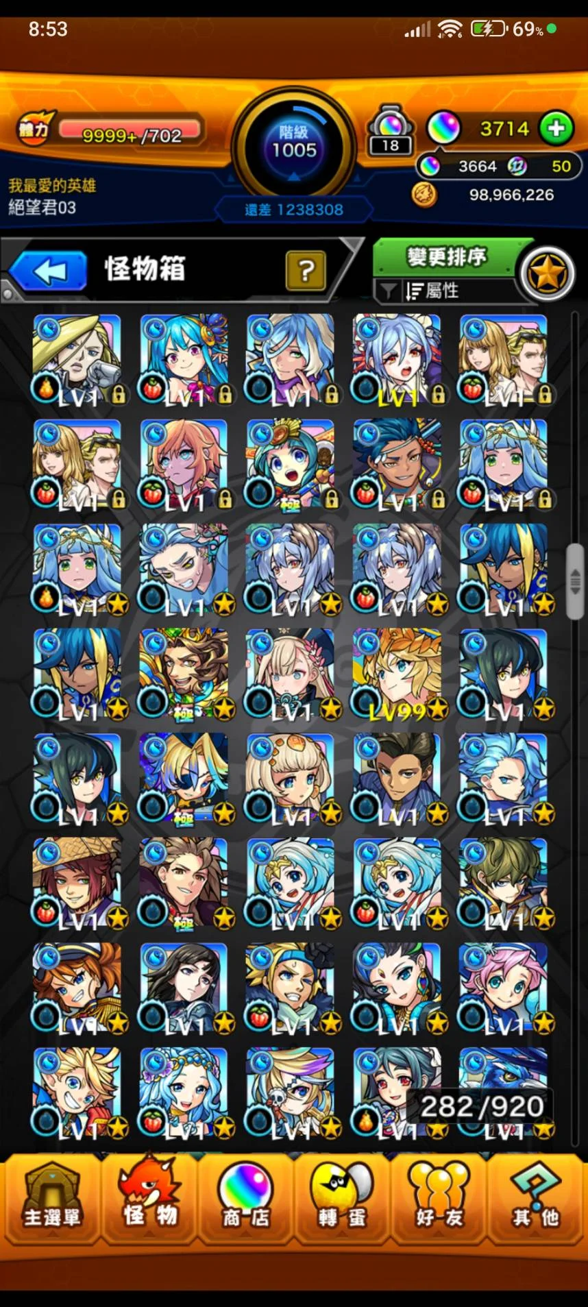 如題~等級1005等 寶珠3664顆(12月12日更新~)