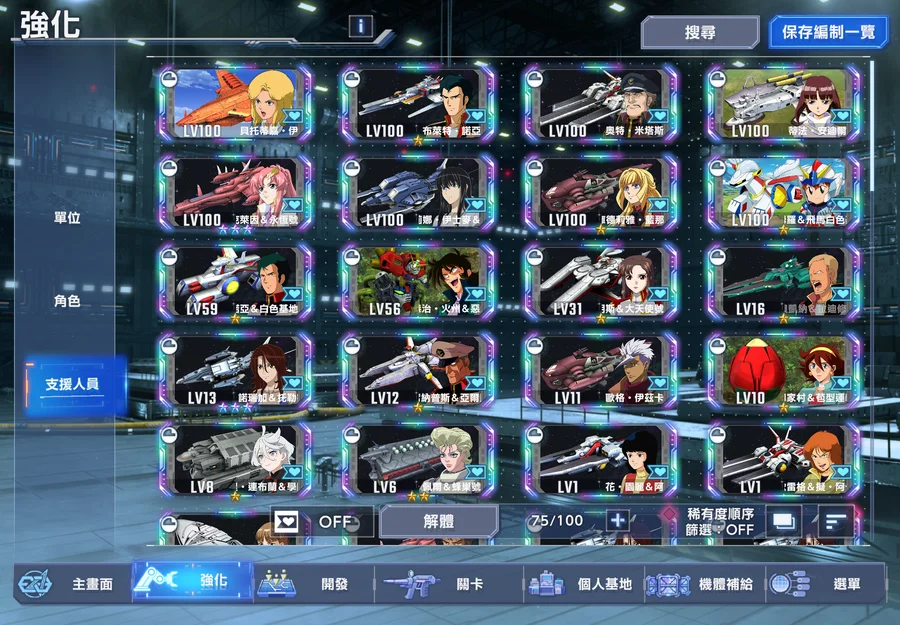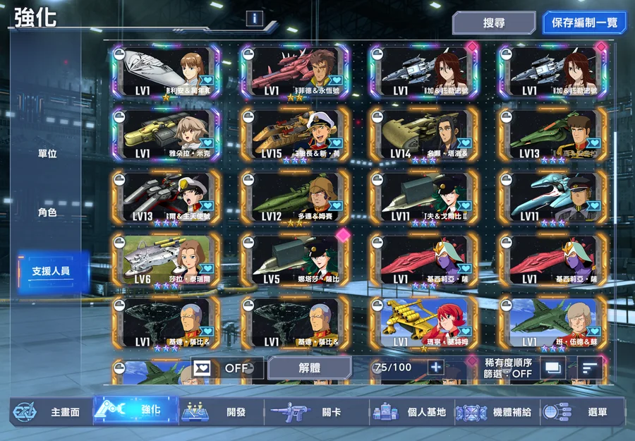 支援鑑方面目前唯三限定艦都有,其中妖女艦3星;泛用標籤補血艦如腦波、突破力、新人類、電光石火也都有。