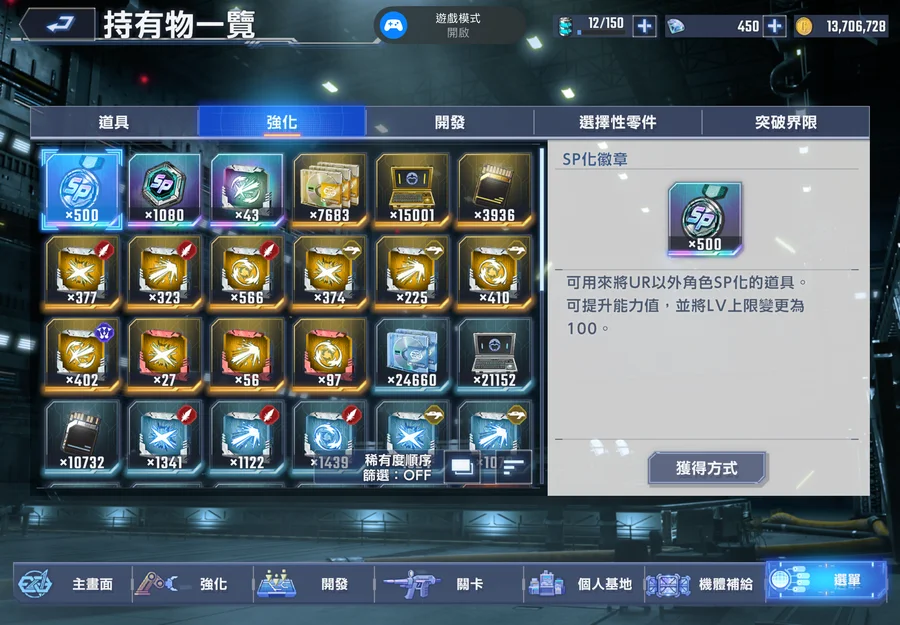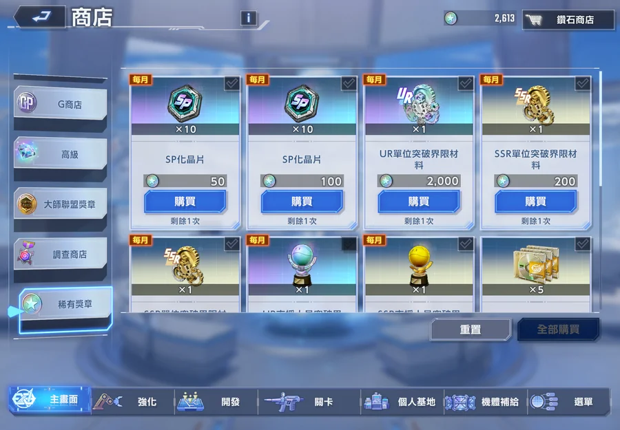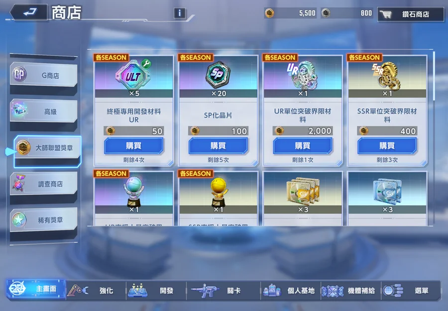 資源方面,UR機體突破零件有1個,商店稀有獎章還有26XX,等於之後每個月更新還能再拿2個,大師聯盟的獎章也都沒動過,相關突破素材可以視需求換出。其他資源可直接見圖片,有想了解的都可以另外詢問。