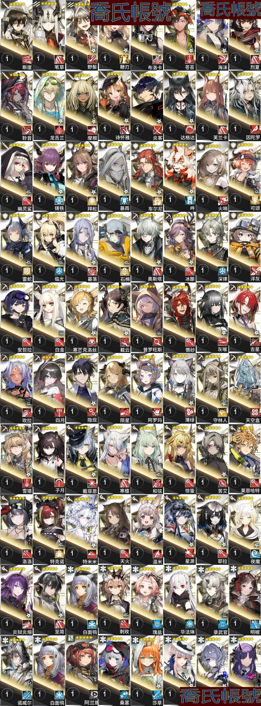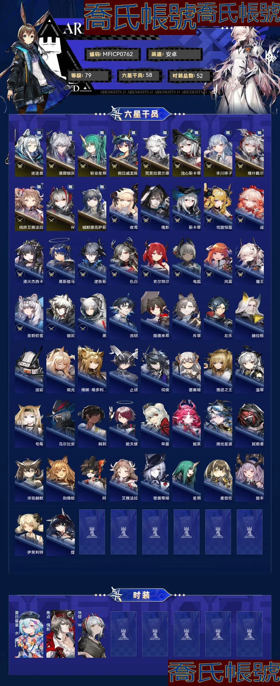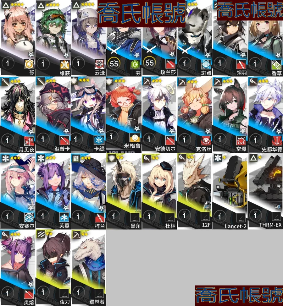 【OBMFICP076242】79級,58六星,22精二,4精一,合成玉數量:13125,源石數量:84,聯動幹員數量:6,時裝數量:52,精二六星:迷迭香,夜鶯,傀影,斯卡蒂,司霆驚蟄,遙,滌火傑西卡,凜御銀灰,莫斯提馬,邏各斯,仇白,史爾特爾,電弧,斬業星熊,風笛,假日威龍陳,魔王,聖聆初雪,荒蕪拉普蘭德,濁心斯卡蒂,豐川祥子,維什戴爾;精一六星:純燼艾雅法拉,銀灰,黑,W;六星幹員:迷迭香,夜鶯,傀影,斯卡蒂,司霆驚蟄,遙,滌火傑西卡,凜御銀灰,莫斯提馬,邏各斯,仇白,史爾特爾,電弧,斬業星熊,風笛,假日威龍陳,魔王,聖聆初雪,荒蕪拉普蘭德,濁心斯卡蒂,豐川祥子,維什戴爾,純燼艾雅法拉,銀灰,黑,W,流明,隱德來希,斥罪,左樂,赫拉格,泥岩,瑕光,維娜·維多利亞,止頌,伺夜,塞雷婭,推進之王,溫蒂,號角,烏爾比安,棘刺,能天使,早露,妮芙,溯光星源,弒君者,淬羽赫默,刻俄柏,阿,艾雅法拉,歌蕾蒂婭,星熊,麥哲倫,緘默德克薩斯,提豐,伊芙利特,煌;聯動幹員:若葉睦,八幡海鈴,祐天寺若麥,三角初華,豐川祥子,九色鹿;時裝:夏日餮宴·水月,焦點·傀影,恍惚·W,旋律的主人·豐川祥子,月下執行者·八幡海鈴,籠中歌者·三角初華,悠然假日HD71·寒檀,情熱魔術師·祐天寺若麥,提線的本我·若葉睦,悠然假日HD29·安比爾,糖果暴擊·奧達,礫瓦·泥岩,相位面容·錫人,主修領域·地靈,北地引路人·提豐,下一頓午茶·斯卡蒂,繪聲繪影·深海色,喜夜侍者·澄閃,正義締造者·野鬃,偽裝·宴,無痕行者·安德切爾,海岸救援改裝·Lancet-2,縱身一躍·傑克,安息處的怪盜·卡達,靜謐午夜DN04·特米米,夏卉FA026·蘇蘇洛,荒原行者·普羅旺斯,古堡清潔專家·阿消,霜息·赫默,八音蛋匠人·格雷伊,夢魘之夢·傀影,意志·德克薩斯,除魅·莫斯提馬,馭浪WR04·斯卡蒂,皇后一號·風笛,歲紅霞·陳,幽靜·白麵鴞,典雅噩兆·拉普蘭德,無題密令·送葬人,小鬼當家·暗索,威塞克斯的信件·玫蘭莎,十字郡·芬,悠然假日HDm06·安賽爾;【官方賬號】