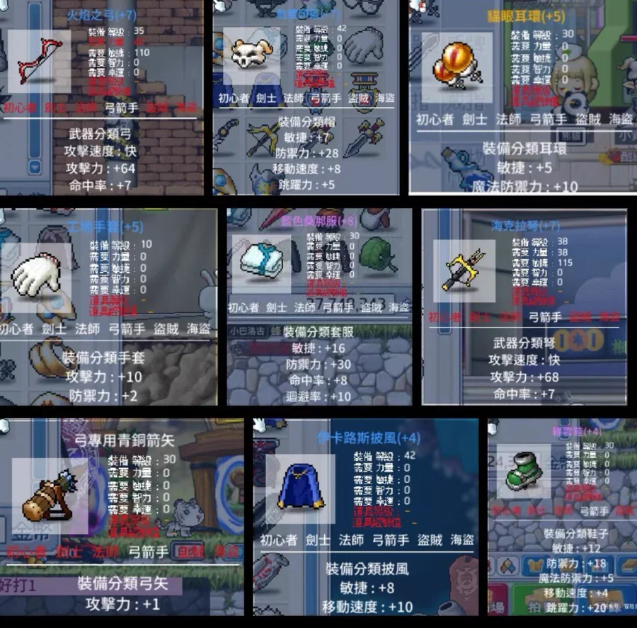 🔥 30級 ~70級 | 💪🏻弓手CP禮包 整套附水錢 帽子:斗笠10屬+骷髏7屬 耳環:5敏 手套:10攻手套 披風:25級8屬+42級6屬10速 套服:16敏 鞋子:9敏15跳3速鞋 | 時價 |