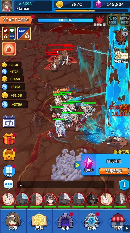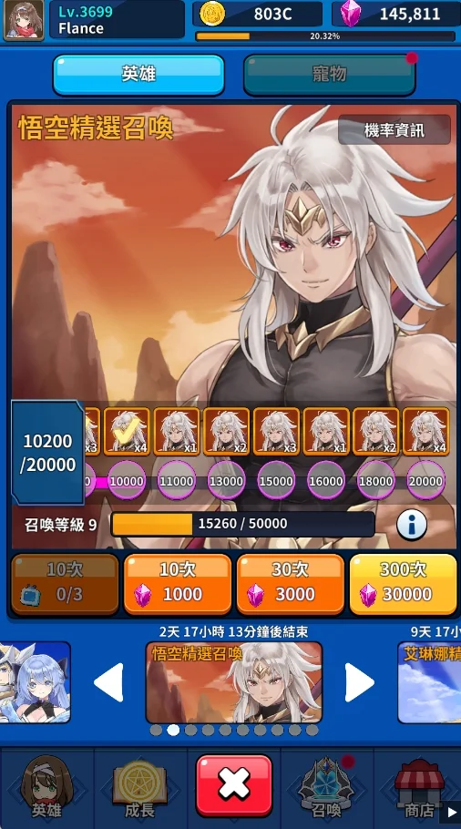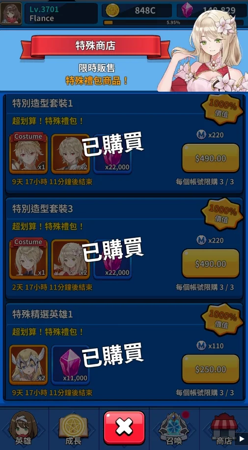 免廣告+黃金鑰匙包*3+造型碎片包*5+騎士成長禮包+世界首領禮包*3+黃金三葉草禮包*3+特殊商店全拉+成長禮包全拉+500萬鑽+造型碎片30萬=1000