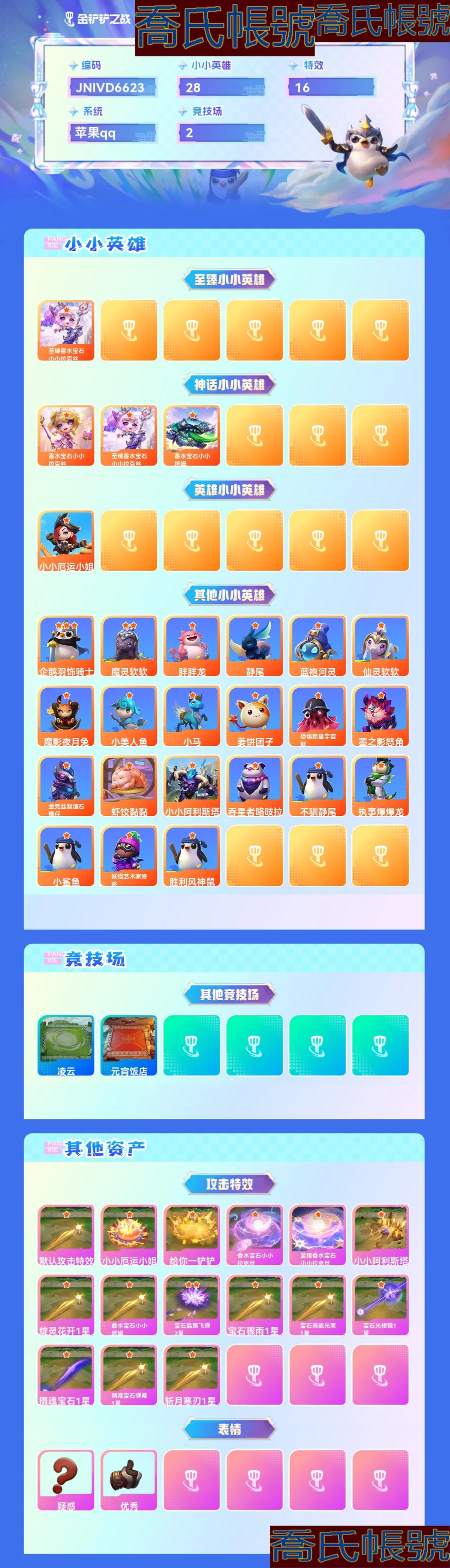 【OBJNIVD662342】等級:Lv69, 幻境繁華度:2級, 卓越級小小英雄數量:0, 至臻級小小英雄數量:1, 神話級小小英雄數量:3, 英雄級小小英雄數量:1, 小小英雄數量:28, 棋盤數量:2, 特效數量:16, 至臻級小小英雄:至臻香水寶石小小拉克絲, 神話級小小英雄:香水寶石小小拉克絲,香水寶石小小塔姆,至臻香水寶石小小拉克絲, 英雄級小小英雄:小小厄運小姐;其它競技場:凌雲, 元宵飯店;三星小小英雄:企鵝羽飾騎士;攻擊特效:攻擊特效預設攻擊特效,攻擊特效小小厄運小姐,攻擊特效給你一鏟鏟,攻擊特效香水寶石小小拉克絲,攻擊特效至臻香水寶石小小拉克絲,攻擊特效小小阿利斯塔,攻擊特效綻靈花開1星,攻擊特效香水寶石小小塔姆,攻擊特效寶石晶簇飛彈2星,攻擊特效寶石驟雨1星,攻擊特效寶石高能光束1星,攻擊特效寶石光稜鏡1星,攻擊特效攝魂寶石1星,攻擊特效精準寶石彈幕1星,攻擊特效斬月寒刃1星【蘋果qq】至臻香水寶石小小拉克絲,香水寶石小小塔姆,香水寶石小小拉克絲。25小小英雄,2棋盤,14特效,3神話小小英雄,可