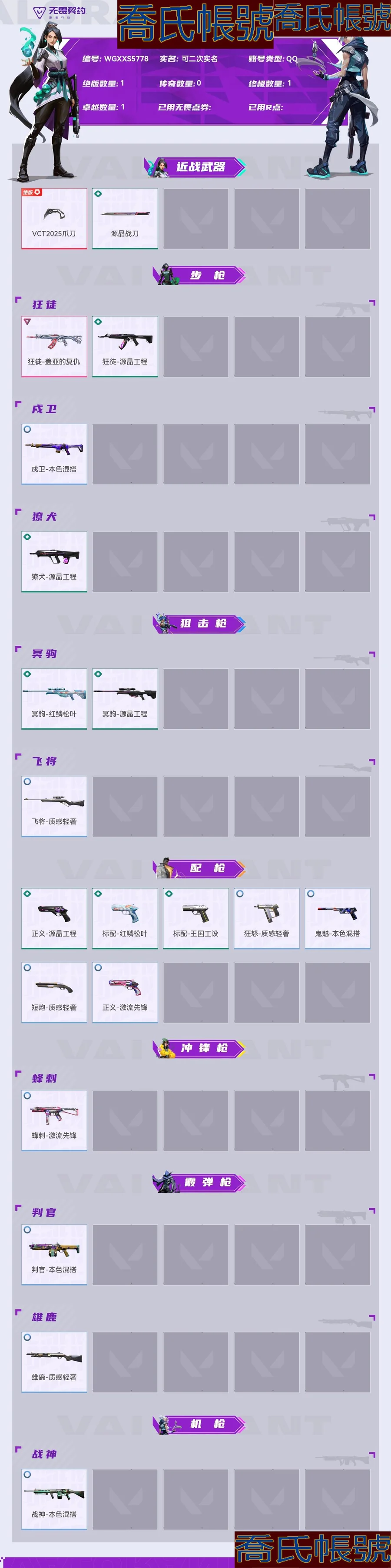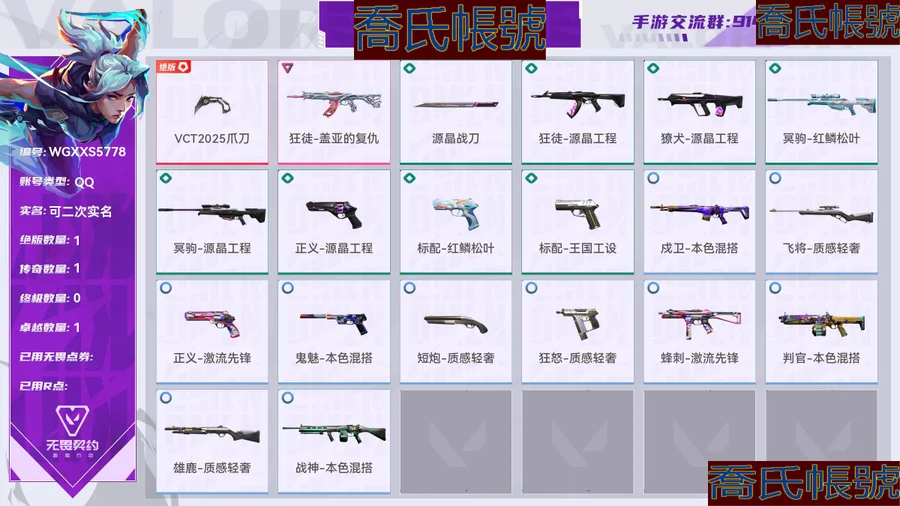 【OBWGXXS577842】Lv121|超凡III, 刀皮數量2,槍皮數量18(絕版1傳奇1終極0卓越1);【刀皮】:近戰武器-VCT2025爪刀,近戰武器-源晶戰刀; 【槍皮】:狂徒-蓋亞的復仇,狂徒-源晶工程,獠犬-源晶工程,冥駒-紅鱗松葉,冥駒-源晶工程,正義-源晶工程,標配-紅鱗松葉,標配-王國工設,戍衛-本色混搭,飛將-質感輕奢,正義-激流先鋒,鬼魅-本色混搭,短炮-質感輕奢,狂怒-質感輕奢,蜂刺-激流先鋒,判官-本色混搭,雄鹿-質感輕奢,戰神-本色混搭;【熱門卡面】:裂土之疆卡面,科迪亞鋼鐵卡面,VCT2025美洲聯賽卡面,VCT2025CN聯賽卡面,VCT2025EMEA聯賽卡面,VCT2025太平洋聯賽卡面,無畏開拓者卡面;【熱門掛飾】:糖果手杖掛飾,恐怖蜥蜴掛飾,VCT2025美洲聯賽掛飾,VCT2025CN聯賽掛飾,VCT2025EMEA聯賽掛飾,VCT2025太平洋聯賽掛飾;【熱門噴漆】:種草噴漆,食腐鳥噴漆,無畏開拓者噴漆;【皮膚可能含有某些特權皮膚,具體以遊戲內實際擁有為準】