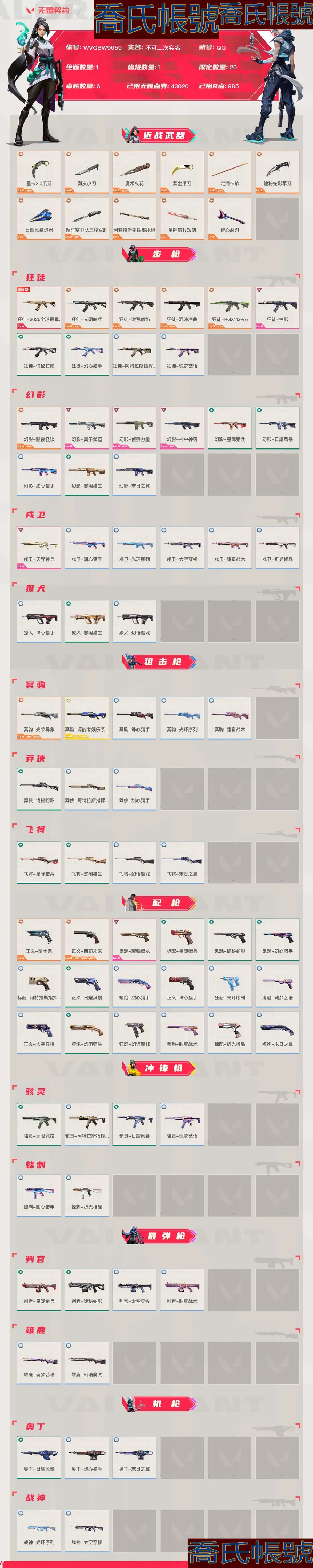 【OBWVGBW905942】Lv139|黃金II, 刀皮數量11,槍皮數量75(絕版1限定20終極1卓越6);皮膚資產價值43020,已用R點985;【刀皮】:近戰武器-顯示卡3.0爪刀,近戰武器-剝皮,近戰武器-魔術火花,近戰武器-紫金爪刀,近戰武器-定海神珍,近戰武器-詭秘蛇影軍刀,近戰武器-日耀風暴遺器,近戰武器-超時空衛隊三稜軍刺,近戰武器-阿特拉斯指揮部甩棍,近戰武器-星際獵兵短劍,近戰武器-碎心裂刃; 【槍皮】:狂徒-2025全球冠軍賽,正義-塑水宗,正義-西部未來,狂徒-光明哨兵,狂徒-洪荒怒焰,狂徒-混沌序曲,狂徒-RGX11zPro,幻影-黯夜怪談,冥駒-光榮異象,冥駒-源能者娛樂系統,鬼魅-耀鱗威龍,狂徒-掠影,幻影-離子武器,幻影-偵察力量,幻影-神中神罰,戍衛-天界神兵,標配-星際獵兵,鬼魅-詭秘蛇影,駭靈-無限競技,判官-星際獵兵,判官-詭秘蛇影,狂徒-詭秘蛇影,幻影-星際獵兵,飛將-星際獵兵,莽俠-詭秘蛇影,狂徒-幻心獵手,狂徒-阿特拉斯指揮部,幻影-日耀風暴,莽俠-阿特拉斯指揮部,正義-日耀風暴,鬼魅-幻心獵手,標配-阿特拉斯指揮部,駭靈-阿特拉斯指揮部,駭靈-日耀風暴,奧丁-日耀風暴,狂徒-瑰夢藝語,幻影-甜心獵手,幻影-悠閒貓生,幻影-末日之翼,戍衛-甜心獵手,戍衛-光環序列,戍衛-太空穿梭,戍衛-甜蜜戰術,戍衛-折光稜晶,獠犬-誅心獵手,獠犬-悠閒貓生,獠犬-幻語魔咒,冥駒-誅心獵手,冥駒-光環序列,冥駒-甜蜜戰術,莽俠-甜心獵手,飛將-悠閒貓生,飛將-幻語魔咒,飛將-末日之翼,正義-誅心獵手,正義-太空穿梭,鬼魅-瑰夢藝語,鬼魅-甜蜜戰術,標配-折光稜晶,短炮-甜心獵手,短炮-悠閒貓生,短炮-末日之翼,狂怒-光環序列,狂怒-幻語魔咒,駭靈-瑰夢藝語,蜂刺-甜心獵手,蜂刺-折光稜晶,判官-太空穿梭,判官-甜蜜戰術,雄鹿-瑰夢藝語,雄鹿-幻語魔咒,奧丁-誅心獵手,奧丁-末日之翼,戰神-光環序列,戰神-太空穿梭;【熱門卡面】:情人節捷風卡面,勢不可擋賢者卡面,勢不可擋蝰蛇卡面,勢不可擋捷風卡面,雙城之戰金克絲卡面;【熱門掛飾】:飛刀掛飾,薰衣草之心掛飾,神中神掛飾;【熱門噴漆】:幽影貓貓舞噴漆,比心噴漆,捷風噴漆,買裝還是存錢噴漆,捷風跳PEEK噴漆;【皮膚可能含有某些特權皮膚,具體以遊戲內實際擁有為準】