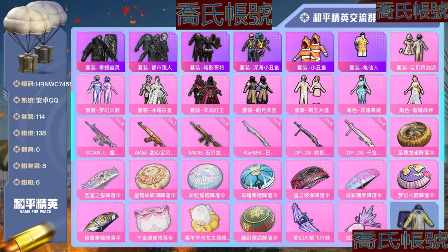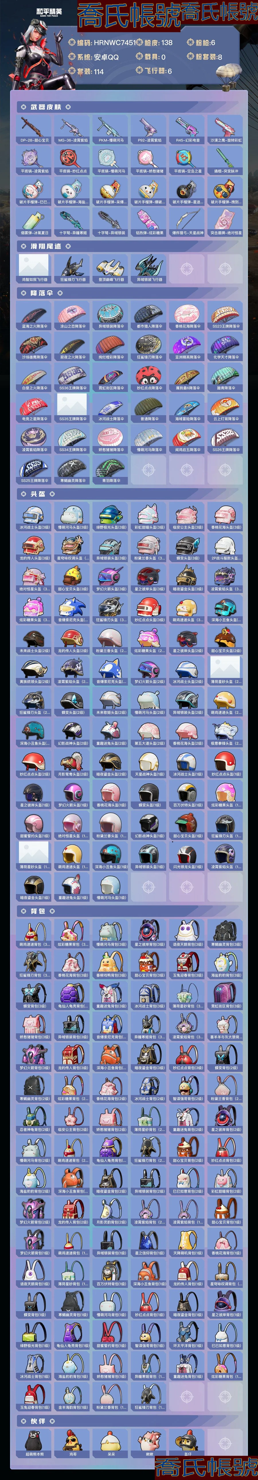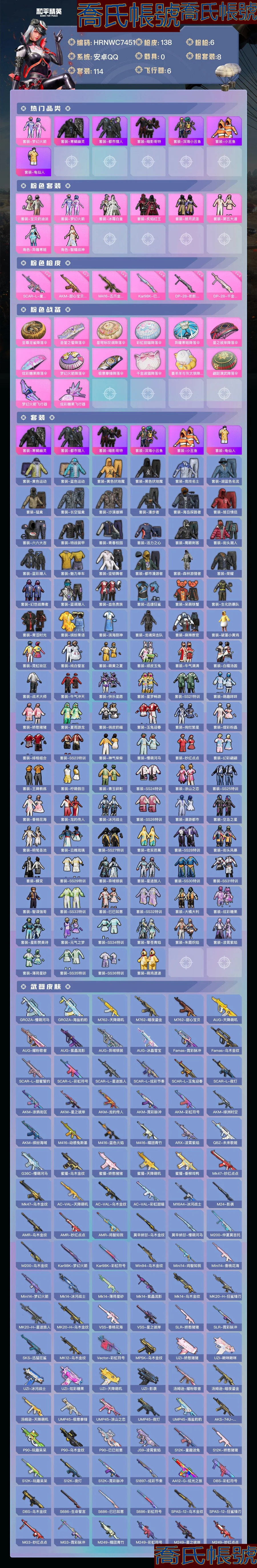 【OBHRNWC745142】熱力值:45731,8粉裝,6粉槍,14粉色戰備,114套裝,138槍械,192裝備,6滑翔尾翼,45降落傘;等級:Lv.62 歷史最高段位:超級王牌12星 當前段位:超級.王牌;王牌印記7次;地鐵滿天賦; 【熱門品類】:套裝-寒蠍幽靈,套裝-都市獵人,套裝-暗影哥特,套裝-深海小丑魚,套裝-小丑魚,套裝-龜仙人;【粉色套裝】:粉裝-寶貝奶油派,粉裝-夢幻火箭,粉裝-冰霜白皇,粉裝-炙焰紅王,粉裝-朗月武聖,粉裝-第五大道,角色-異瞳寒姬,角色-智耀戰神;【粉色槍械】:SCAR-L-童趣迷兔[6級],AKM-甜心寶貝[7級],M416-五爪金龍[5級],Kar98K-巳巳如意[5級],DP-28-豹影疾電[5級],DP-28-千金淑貓[4級];【粉色滑翔尾翼】:夢幻火箭飛行器,炫彩糖果飛行器;【粉色降落傘】:至尊龍雀降落傘,聖堂之誓降落傘,星穹詠嘆調降落傘,彩虹甜喵降落傘,異瞳寒姬降落傘,星之彼岸降落傘,炫彩糖果降落傘,夢幻火箭降落傘,極意拳鋒降落傘,千金淑貓降落傘,喜羊羊與灰太狼降落傘,翩躚演武降落傘;【其他套裝】:套裝-黃色運動,套裝-藍色運動,套裝-黃色伏地魔,套裝-黑色伏地魔,套裝-競技名士,套裝-湖藍色名流,套裝-猛禽,套裝-長空猛禽,套裝-沙漠雄獅,套裝-漫步者,套裝-海島探路者,套裝-旭日情侶,套裝-六六大吉,套裝-特戰裝甲,套裝-青春校園,套裝-活力之心,套裝-鷹眼刺客,套裝-街頭潮人,套裝-藍彩潮人,套裝-魅力單車,套裝-堅韌舞者,套裝-都市漫遊者,套裝-森林遊獵者,套裝-榮耀,套裝-幻世戰舞者,套裝-藍調潮人,套裝-血色貴族,套裝-迅捷狂鯊,套裝-呆萌鐵蟹,套裝-生化防暴隊,套裝-青澀時光,套裝-繽紛果語,套裝-濱海廚神,套裝-龍魂突擊隊,套裝-麻辣教官,套裝-破蛋小黃雞,套裝-霓虹街區,套裝-純白誓言,套裝-萌黃之夏,套裝-頑皮玉兔,套裝-牛氣滿滿,套裝-白糯湯圓,套裝-戰術大師,套裝-牛氣沖天,套裝-快樂星願,套裝-星夢暢遊,套裝-SS21特訓,套裝-萌趣咩咩,套裝-嬌憨豬豬,套裝-夏雨遊龍,套裝-俏皮奶喵,套裝-玉兔迎春,套裝-絢爛繁星,套裝-熠彩粉晶,套裝-緋格組合,套裝-SS23特訓,套裝-神氣柴柴,套裝-懵萌河馬,套裝-妙紅點點,套裝-幻彩翩翩,套裝-王牌教練,套裝-檸萌假日,套裝-青玉碎影,套裝-SS24特訓,套裝-塗山之戀,套裝-SS25特訓,套裝-香桃花海,套裝-龍的傳人,套裝-冰河戰士,套裝-SS26特訓,套裝-漫遊都市,套裝-空島之星,套裝-明鴛聖池,套裝-雲魄琉璃,套裝-SS27特訓,套裝-老實芭蕉,套裝-SS28特訓,套裝-街頭風暴,套裝-蝶變,套裝-SS29特訓,套裝-異域銀裝,套裝-星途旅人,套裝-SS30特訓,套裝-SS31特訓,套裝-智謀強哥,套裝-SS33特訓,套裝-巳巳如意,套裝-SS32特訓,套裝-大橘大利,套裝-炫彩糖果,套裝-星影讚美詩,套裝-元氣之夢,套裝-SS34特訓,套裝-擎蒼青焰,套裝-朱霞熾焰,套裝-凌霄紫焰,套裝-薄荷星砂,套裝-SS35特訓,套裝-SS36特訓,套裝-萌雞速遞;其他槍械:GROZA-懵萌河馬,GROZA-海鹽豹豹,M762-天降萌嘰,M762-暗夜鎏金,M762-甜心寶貝,AUG-天降萌嘰,AUG-耀粉歌者,AUG-紫晶流影,AUG-異域銀裝,AUG-冰晶雪寶,Famas-霓彩脈衝,Famas-烏木金紋,SCAR-L-甜蜜誓約,SCAR-L-彩虹符號,SCAR-L-星途旅人,SCAR-L-炫彩節奏,SCAR-L-玉兔迎春,SCAR-L-夜燈,AKM-塗鴉街區,AKM-星之彼岸,AKM-龍的傳人,AKM-霓彩脈衝,AKM-彩虹符號,AKM-綠洲時空,AKM-繽紛海域,M416-動感兔斯基,M416-藍色火焰,M416-糯團青竹,ARX-凌霄紫焰,QBZ-未來歌姬,G36C-懵萌河馬,蜜獾-烏木金紋,蜜獾-嬌憨豬豬,蜜獾-天降萌嘰,蜜獾-垂柳戲鴨,Mk47-妙紅點點,Mk47-烏木金紋,AC-VAL-天降萌嘰,AC-VAL-烏木金紋,AC-VAL-彩虹甜喵,M16A4-冰河戰士,M24-影襲,AMR-烏木金紋,AMR-妙紅點點,AMR-雞智如我,莫辛納甘-烏木金紋,莫辛納甘-懵萌河馬,M200-仲夏莫吉托,M200-烏木金紋,Kar98K-夢幻火箭,Kar98K-彩虹符號,Win94-烏木金紋,Mini14-雞智如我,Mini14-香桃花海,Mini14-夢幻火箭,Mk14-冰河戰士,Mk14-薄荷星砂,Mk14-紫晶流影,Mk14-烏木金紋,MK20-H-狂鯊鋒刃,MK20-H-星途旅人,MK20-H-烏木金紋,VSS-香桃花海,VSS-星之彼岸,SLR-嬌憨豬豬,SLR-霓彩脈衝,SKS-迅猛狂鯊,MK12-烏木金紋,Vector-彩虹符號,MP5K-烏木金紋,UZI-嬌憨豬豬,UZI-啾咪啾咪,UZI-冰河戰士,UZI-炫彩糖果,UZI-天降萌嘰,UZI-影襲,湯姆遜-耀粉歌者,湯姆遜-暗夜鎏金,湯姆遜-天降萌嘰,UMP45-極意拳鋒,UMP45-塗山之戀,UMP45-夜燈,UMP45-海鹽豹豹,AKS-74U-烏木金紋,P90-玩趣呆呆,P90-烏木金紋,P90-巳巳如意,JS9-凌霄紫焰,S12K-童趣迷兔,S12K-嬌憨豬豬,S12K-玩趣呆呆,S12K-夜燈,S12K-霓彩脈衝,S1897-炫彩節奏,AA12-G-炫光之旅,DBS-彩虹符號,DBS-烏木金紋,S686-生命誓言,S686-巳巳如意,S686-彩虹符號,SPAS-12-烏木金紋,SPAS-12-狂鯊鋒刃,MG3-妙紅點點,MG3-霓彩脈衝,M249-糯團青竹,M249-彩虹符號,M249-星之彼岸,M249-妙紅點點,DP-28-甜心寶貝,MG-36-凌霄紫焰,PKM-懵萌河馬,P92-凌霄紫焰,R45-幻彩電音,沙漠之鷹-旋轉彩虹,平底鍋-凌霄紫焰,平底鍋-妙紅點點,平底鍋-懵萌河馬,平底鍋-嬌憨豬豬,平底鍋-空島之星,撬棍-突變脈衝,破片手榴彈-巳巳如意,破片手榴彈-海鹽豹豹,破片手榴彈-呆爆全場,破片手榴彈-爆破雪人,破片手榴彈-星途旅人,破片手榴彈-拽到爆炸,煙霧彈-冰氧夏日,十字弩-異瞳寒姬,十字弩-異域銀裝,鋁熱彈-炫彩糖果,爆炸獵弓-天星戰神,突擊盾牌-絕對恆星;【其他滑翔尾翼】:雞智如我飛行器,狂鯊鋒刃飛行器,登頂巔峰飛行器,異域銀裝飛行器;【其他降落傘】:藍海之火降落傘,塗山之戀降落傘,異域銀裝降落傘,都市獵人降落傘,香桃花海降落傘,SS23王牌降落傘,沙場雄鷹降落傘,寂夜之火降落傘,絢爛橙彩降落傘,狂鯊鋒刃降落傘