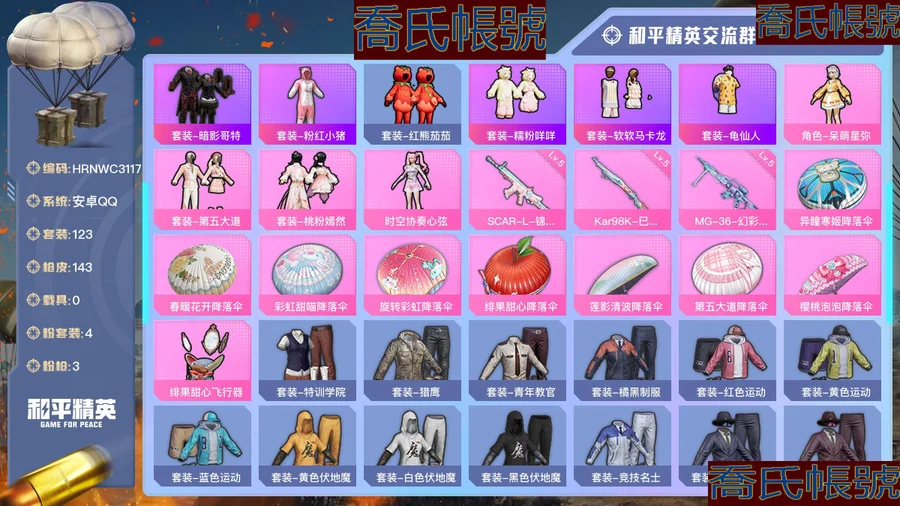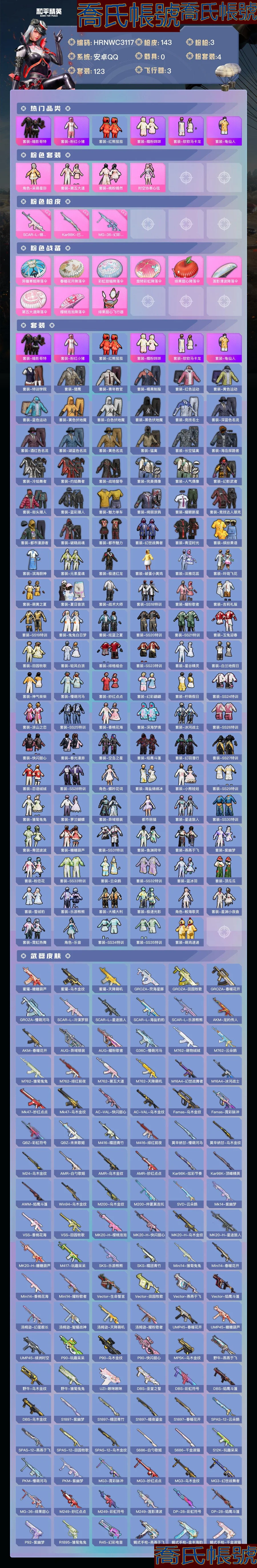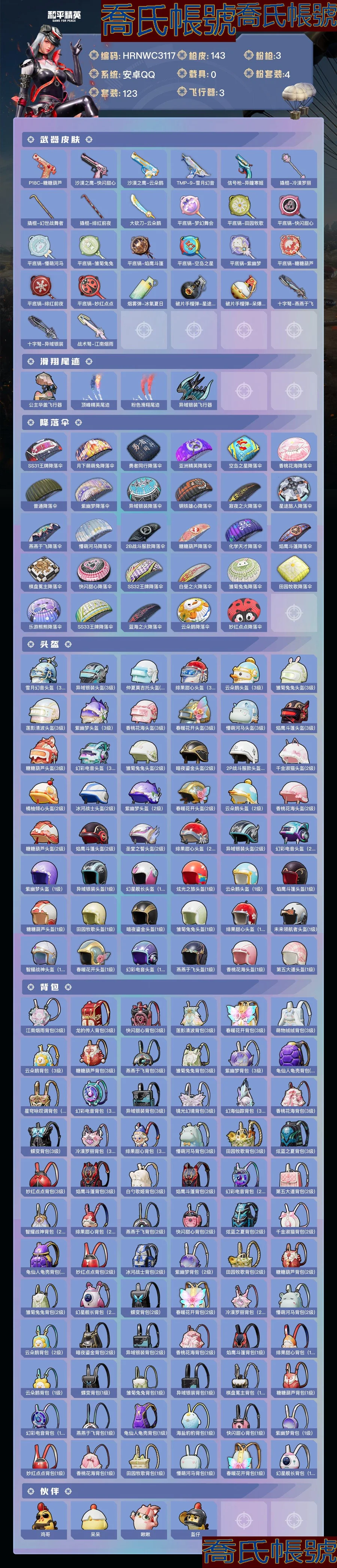 【OBHRNWC311742】熱力值:42163,4粉裝,3粉槍,9粉色戰備,123套裝,143槍械,143裝備,5滑翔尾翼,37降落傘;等級:Lv.53 歷史最高段位:卓越王牌9星 當前段位:英勇.黃金Ⅰ;王牌印記4次 卓越印記1次; 【熱門品類】:套裝-暗影哥特,套裝-粉紅小豬,套裝-紅熊茄茄,套裝-糯粉咩咩,套裝-軟軟馬卡龍,套裝-龜仙人;【粉色套裝】:角色-呆萌星彌,粉裝-第五大道,粉裝-桃粉嫣然,粉裝-時空協奏心絃;【粉色槍械】:SCAR-L-錦繡綿綿[5級],Kar98K-巳巳如意[5級],MG-36-幻彩電音[5級];【粉色滑翔尾翼】:緋果甜心飛行器;【粉色降落傘】:異瞳寒姬降落傘,春暖花開降落傘,彩虹甜喵降落傘,旋轉彩虹降落傘,緋果甜心降落傘,蓮影清波降落傘,第五大道降落傘,櫻桃泡泡降落傘;【其他套裝】:套裝-特訓學院,套裝-獵鷹,套裝-青年教官,套裝-橘黑制服,套裝-紅色運動,套裝-黃色運動,套裝-藍色運動,套裝-黃色伏地魔,套裝-白色伏地魔,套裝-黑色伏地魔,套裝-競技名士,套裝-深藍色名流,套裝-酒紅色名流,套裝-湖藍色名流,套裝-黃色名流,套裝-猛禽,套裝-長空猛禽,套裝-海島探路者,套裝-冷焰舞者,套裝-灼焰舞者,套裝-戰地督導,套裝-完美偶像,套裝-人氣偶像,套裝-幻影武者,套裝-街頭潮人,套裝-藍彩潮人,套裝-魅力單車,套裝-綺麗塗鴉,套裝-耀眼新星,套裝-競技達人朋克,套裝-都市漫遊者,套裝-破曉戰魂,套裝-都市魅力,套裝-幻世戰舞者,套裝-青澀時光,套裝-繽紛果語,套裝-濱海廚神,套裝-元素星魂,套裝-極速紅龍,套裝-破蛋小黃雞,套裝-淡雅花蕊,套裝-玲瓏飛花,套裝-萌黃之夏,套裝-夏日音浪,套裝-戰術大師,套裝-SS18特訓,套裝-耀粉歌者,套裝-吉莉禮服,套裝-SS19特訓,套裝-兔兔白日夢,套裝-炫藍之夏,套裝-SS20特訓,套裝-SS21特訓,套裝-玉兔迎春,套裝-田園牧歌,套裝-輕風白浪,套裝-緋格組合,套裝-SS23特訓,套裝-星谷精靈,套裝-白蘭地假日,套裝-神氣柴柴,套裝-懵萌河馬,套裝-妙紅點點,套裝-幻彩翩翩,套裝-檸萌假日,套裝-SS24特訓,套裝-塗山之戀,套裝-SS25特訓,套裝-香桃花海,套裝-深海夢境,套裝-冰河戰士,套裝-SS26特訓,套裝-快閃甜心,套裝-春光漫遊,套裝-空島之星,套裝-焰鷹斗篷,套裝-幻羽潛行,套裝-SS27特訓,套裝-戀語絨絨,套裝-SS28特訓,角色-蝶吟花詞,套裝-海鹽綿綿冰,套裝-小熊娃娃,套裝-SS29特訓,套裝-雛菊兔兔,套裝-蘿蘭蝴蝶,套裝-異域銀裝,角色-都市麗貓,套裝-星途旅人,套裝-SS30特訓,套裝-青團波波,套裝-糖糖葫蘆,套裝-SS31特訓,套裝-魚淵荷華,套裝-燕燕於飛,套裝-紫幽夢,套裝-粉戀花,套裝-SS33特訓,套裝-雲朵鵝,套裝-SS32特訓,套裝-藍冰羽,套裝-頂瓜瓜,套裝-雪絨豹,套裝-樂遊熊熊,套裝-大橘大利,套裝-極速光影,角色-鮫海歌靈,套裝-星淵小夜曲,套裝-霓虹熱舞,角色-樂音,套裝-SS34特訓,套裝-SS35特訓,套裝-萌雞速遞;其他槍械:蜜獾-糖糖葫蘆,蜜獾-烏木金紋,蜜獾-天降萌嘰,GROZA-熒海星豚,GROZA-田園牧歌,GROZA-春暖花開,GROZA-懵萌河馬,SCAR-L-冷漠羅麗,SCAR-L-星途旅人,SCAR-L-海鹽豹豹,SCAR-L-樂遊熊熊,AKM-龍的傳人,AKM-春暖花開,AUG-異域銀裝,AUG-耀粉歌者,G36C-懵萌河馬,M762-萌物絨絨,M762-雲朵鵝,M762-雛菊兔兔,M762-緋紅前夜,M762-第五大道,M762-天降萌嘰,M16A4-幻世戰舞者,M16A4-冰河戰士,Mk47-妙紅點點,Mk47-烏木金紋,AC-VAL-快閃甜心,AC-VAL-烏木金紋,Famas-烏木金紋,Famas-霓彩脈衝,QBZ-彩虹符號,QBZ-未來歌姬,M416-糯團青竹,M416-緋紅前夜,莫辛納甘-懵萌河馬,莫辛納甘-烏木金紋,M24-烏木金紋,AMR-白勺歌姬,AMR-烏木金紋,AMR-妙紅點點,Kar98K-炫彩節奏,Kar98K-頂峰精英,AWM-焰鷹斗篷,Win94-烏木金紋,M200-烏木金紋,M200-仲夏莫吉托,SVD-雲朵鵝,Mk14-紫幽夢,VSS-香桃花海,VSS-田園牧歌,MK20-H-櫻桃泡泡,MK20-H-快閃甜心,MK20-H-烏木金紋,MK20-H-星途旅人,MK20-H-糖糖葫蘆,M417-玩趣呆呆,SKS-樂遊熊熊,SKS-糯團青竹,Mini14-雛菊兔兔,Mini14-春暖花開,Mini14-香桃花海,Mini14-耀粉歌者,Vector-生命誓言,Vector-田園牧歌,Vector-燕燕於飛,Vector-焰鷹斗篷,湯姆遜-幻星艦長,湯姆遜-智耀戰神,湯姆遜-天降萌嘰,湯姆遜-耀粉歌者,UMP45-春暖花開,UMP45-糖糖葫蘆,UMP45-綠洲時空,P90-玩趣呆呆,P90-烏木金紋,P90-快閃甜心,MP5K-烏木金紋,野牛-燕燕於飛,野牛-烏木金紋,野牛-雛菊兔兔,UZI-啾咪啾咪,DBS-聖堂之誓,DBS-彩虹符號,DBS-焰鷹斗篷,DBS-烏木金紋,S1897-紫幽夢,S1897-糯團青竹,S1897-暗夜鎏金,S1897-春暖花開,SPAS-12-雲朵鵝,SPAS-12-燕燕於飛,SPAS-12-田園牧歌,SPAS-12-烏木金紋,S686-白勺歌姬,S686-千金淑貓,S12K-玩趣呆呆,PKM-懵萌河馬,PKM-紫幽夢,MG3-霓彩脈衝,MG3-妙紅點點,MG3-烏木金紋,MG3-幻世戰舞者,MG-36-緋果甜心,M249-妙紅點點,M249-彩虹符號,M249-蓮影清波,DP-28-彩虹符號,DP-28-焰鷹斗篷,P92-紫幽夢,R1895-雛菊兔兔,R45-幻彩電音,蠍式手槍-燕燕於飛,蠍式手槍-金豐海韻,蠍式手槍-千金淑貓,P18C-糖糖葫蘆,沙漠之鷹-快閃甜心,沙漠之鷹-雲朵鵝,TMP-9-雪月幻音,信號槍-異瞳寒姬,撬棍-冷漠羅麗,撬棍-幻世戰舞者,撬棍-緋紅前夜,大砍刀-雲朵鵝,平底鍋-夢幻舞會,平底鍋-田園牧歌,平底鍋-快閃甜心,平底鍋-懵萌河馬,平底鍋-雛菊兔兔,平底鍋-焰鷹斗篷,平底鍋-空島之星,平底鍋-紫幽夢,平底鍋-糖糖葫蘆,平底鍋-緋紅前夜,平底鍋-妙紅點點,煙霧彈-冰氧夏日,破片手榴彈-星途旅人,破片手榴彈-呆爆全場,十字弩-燕燕於飛,十字弩-異域銀裝,戰術弩-江南煙雨;【其他滑翔尾翼】:公主華蓋飛行器,頂峰精英尾跡,粉色滑翔尾跡,異域銀裝飛行器;【其他降落傘】:SS31王牌降落傘,月下萌萌兔