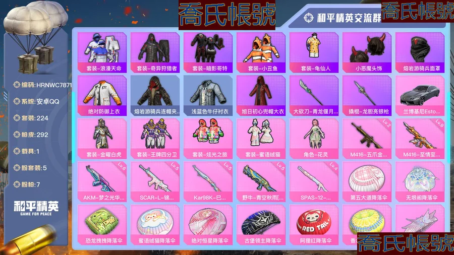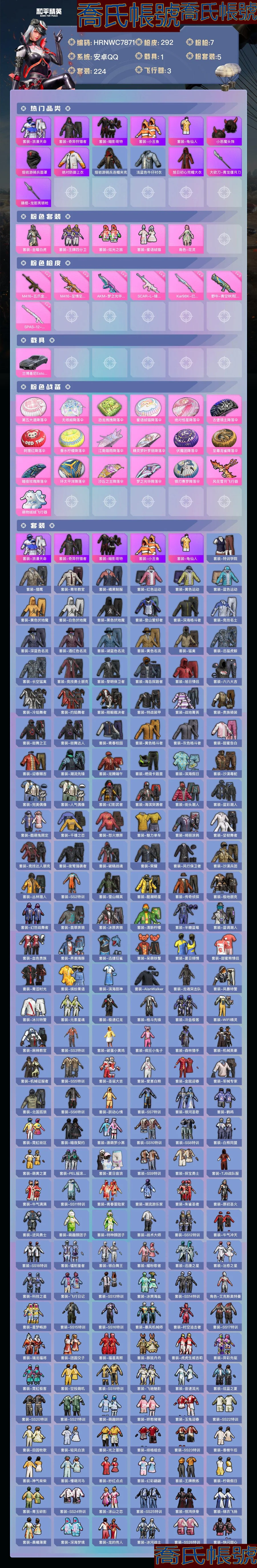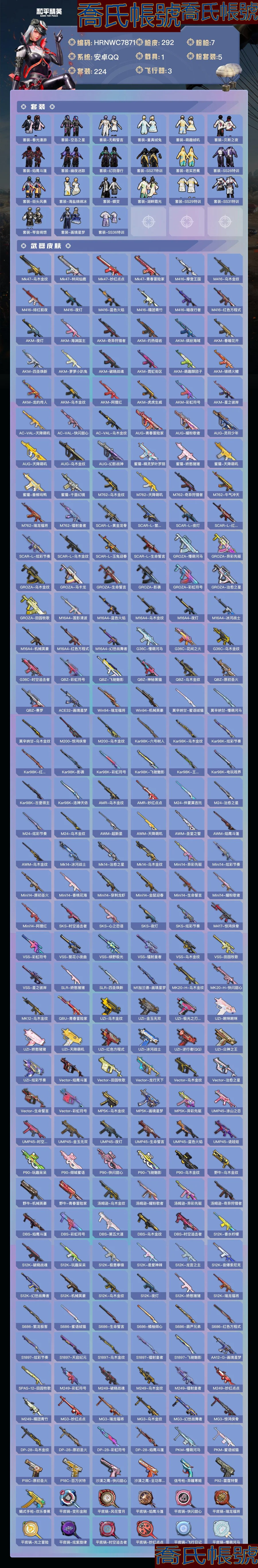 【OBHRNWC787142】熱力值:97338,5粉裝,7粉槍,1載具,19粉色戰備,224套裝,292槍械,330裝備,5滑翔尾翼,109降落傘;等級:Lv.67 歷史最高段位:卓越王牌8星 當前段位:超級.王牌4星;王牌印記19次 卓越印記1次; 【熱門品類】:套裝-浪漫天命,套裝-奇異狩獵者,套裝-暗影哥特,套裝-小丑魚,套裝-龜仙人,小惡魔頭飾,熔岩遊騎兵面罩,絕對防禦上衣,熔岩遊騎兵連帽夾克,淺藍色牛仔襯衣,旭日初心兜帽大衣,大砍刀-青龍偃月刀,撬棍-龍膽亮銀槍;【粉色套裝】:粉裝-金曜白虎,粉裝-王牌四分衛,粉裝-炫光之旅,粉裝-蜜語絨貓,角色-花靈;【粉色槍械】:M416-五爪金龍[2級],M416-至情至聖[9級],AKM-夢之光華[6級],SCAR-L-錦繡綿綿[5級],Kar98K-巳巳如意[5級],野牛-青空秋雨[5級],SPAS-12-蜜語絨貓[4級];【粉色載具】:蘭博基尼Estoque(銀翼灰);【粉色滑翔尾翼】:風花雪月飛行器,萌物絨絨飛行器;【粉色降落傘】:第五大道降落傘,無垠閣降落傘,恐龍拽拽降落傘,蜜語絨貓降落傘,絕對恆星降落傘,古堡領主降落傘,阿狸紅降落傘,香水檸檬降落傘,江南煙雨降落傘,精靈夢葉羅麗降落傘,伏魔團降落傘,至尊龍雀降落傘,暗夜玫瑰降落傘,環太平洋降落傘,沙丘之主降落傘,夢之光華降落傘,銀刃賽羅降落傘;【其他套裝】:套裝-特訓學院,套裝-獵鷹,套裝-青年教官,套裝-橘黑制服,套裝-紅色運動,套裝-黃色運動,套裝-藍色運動,套裝-黃色伏地魔,套裝-白色伏地魔,套裝-黑色伏地魔,套裝-登山愛好者,套裝-深海格鬥者,套裝-競技名士,套裝-深藍色名流,套裝-酒紅色名流,套裝-湖藍色名流,套裝-黃色名流,套裝-猛禽,套裝-迅猛虎鯨,套裝-長空猛禽,套裝-競技勇士朋克,套裝-黎明保衛者,套裝-海島探路者,套裝-旭日情侶,套裝-六六大吉,套裝-冷焰舞者,套裝-灼焰舞者,套裝-剛毅裁決者,套裝-特戰裝甲,套裝-戰地菁英,套裝-貴族騎裝,套裝-街舞之王,套裝-街舞達人,套裝-青春校園,套裝-黃色格鬥者,套裝-灰色格鬥者,套裝-甜蜜告白,套裝-迎春賜吉,套裝-潮流先鋒,套裝-龍騰端午,套裝-燃燒卡路里,套裝-濱海假日,套裝-沙漠毒蛇,套裝-完美偶像,套裝-人氣偶像,套裝-幻影武者,套裝-海濱突襲者,套裝-街頭潮人,套裝-藍彩潮人,套裝-酷萌兔限定,套裝-千禧之戀,套裝-怒火燎原,套裝-魅力單車,套裝-綺麗塗鴉,套裝-堅韌舞者,套裝-競技達人朋克,套裝-夜鶯強襲者,套裝-破曉戰魂,套裝-榮耀,套裝-風行保衛者,套裝-沙漠兵團,套裝-叢林獵人,套裝-SS2特訓,套裝-雪山精英,套裝-酷潮明星,套裝-傳奇偵探,套裝-極地朋克,套裝-幻世戰舞者,套裝-翡翠奔狼,套裝-冰原奔狼,套裝-清新檸檬,套裝-半糖藍莓,套裝-藍調潮人,套裝-血色貴族,套裝-弄潮海豚,套裝-迅捷狂鯊,套裝-呆萌鐵蟹,套裝-夏日傾情,套裝-甜蜜熊情侶,套裝-青澀時光,套裝-繽紛果語,套裝-濱海廚神,套裝-AlanWalker,套裝-龍魂突擊隊,套裝-風暴特警,套裝-冰川特警,套裝-元素星魂,套裝-極速紅龍,套裝-格鬥先鋒,套裝-冷血極客,套裝-WiFi精靈,套裝-麻辣教官,套裝-SS3特訓,套裝-破蛋小黃雞,套裝-瘋狂小兔子,套裝-森林獵手,套裝-機械英豪,套裝-機械征服者,套裝-SS5特訓,套裝-聖誕大吉,套裝-愛崽白熊,套裝-金鼠迎春,套裝-軍械專家,套裝-北國孤狼,套裝-SS6特訓,套裝-躍動心情,套裝-SS7特訓,套裝-銀河聖歌,套裝-鶴鳴,套裝-霓虹街區,套裝-暗夜契約,套裝-激萌羅小黑,套裝-SS10特訓,套裝-SS8特訓,套裝-白熊同盟,套裝-萌黃之夏,套裝-PEL搖滾競夢者,套裝-夏日音浪,套裝-SS9特訓,套裝-探寶勇士,套裝-TJB戰隊服,套裝-牛氣滿滿,套裝-SS11特訓,套裝-青春冒險家,套裝-潮流遊樂家,套裝-朱雀聖者,套裝-原初聖火,套裝-逆風勇士,套裝-萌趣顏糰子,套裝-特種顏糰子,套裝-戰術大師,套裝-SS12特訓,套裝-牛氣沖天,套裝-SS18特訓,套裝-鐳射皇者,套裝-銀白舞王,套裝-耀粉歌者,套裝-迅捷之星,套裝-治癒之星,套裝-科技之星,套裝-飛行日記,套裝-SS13特訓,套裝-冰爽海鹽,套裝-SS14特訓,角色-艾克斯奧特曼,套裝-星夢暢遊,套裝-SS15特訓,套裝-SS16特訓,套裝-暴風機械師,套裝-時空追擊者,套裝-SS17特訓,套裝-瑞龍福將,套裝-團圓交子,套裝-福星高照,套裝-豚鼠丹丹,套裝-虎虎生威吉莉,套裝-異彩先驅,套裝-霓虹極客,套裝-空投萌嘰,套裝-SS19特訓,套裝-飛馳魅影,套裝-音速流光,套裝-炫藍之夏,套裝-SS20特訓,套裝-SS21特訓,套裝-萌趣咩咩,套裝-嬌憨豬豬,套裝-玉兔迎春,套裝-SS22特訓,套裝-田園牧歌,套裝-輕風白浪,套裝-光之冒險,套裝-緋格組合,套裝-SS23特訓,套裝-香榭午後,套裝-神氣柴柴,套裝-懵萌河馬,套裝-妙紅點點,套裝-幻彩翩翩,套裝-王牌教練,套裝-檸萌假日,套裝-青玉碎影,套裝-SS24特訓,套裝-塗山之戀,套裝-SS25特訓,套裝-驚鴻俠骨,套裝-錦衣飛揚,套裝-晨曦薄霧,套裝-深海夢境,套裝-龍的傳人,套裝-冰河戰士,套裝-SS26特訓,套裝-快閃甜心,套裝-春光漫遊,套裝-空島之星,套裝-無暇誓言,套裝-童真絨兔,套裝-萌趣絨嘰,套裝-貝斯之夜,套裝-焰鷹斗篷,套裝-幽夜迷蹤,套裝-幻羽潛行,套裝-SS27特訓,套裝-老實芭蕉,套裝-SS28特訓,套裝-街頭風暴,套裝-海鹽綿綿冰,套裝-蝶變,套裝-湖畔霞光,套裝-SS29特訓,套裝-SS31特訓,套裝-琴音綺想,套裝-畫境星夢,套裝-SS36特訓;其他槍械:Mk47-烏木金紋,Mk47-林間仙鹿,Mk47-妙紅點點,Mk47-青春冒險家,M416-摩登王國,M416-烏木金紋,M416-緋紅前夜,M416-夜燈,M416-藍色火焰,M416-糯團青竹,M416-暗夜行者,M416-紅色方程式,AKM-夜燈,AKM-海淵國主,AKM-奇異狩獵者,AKM-灼熱熔岩,AKM-繽紛海