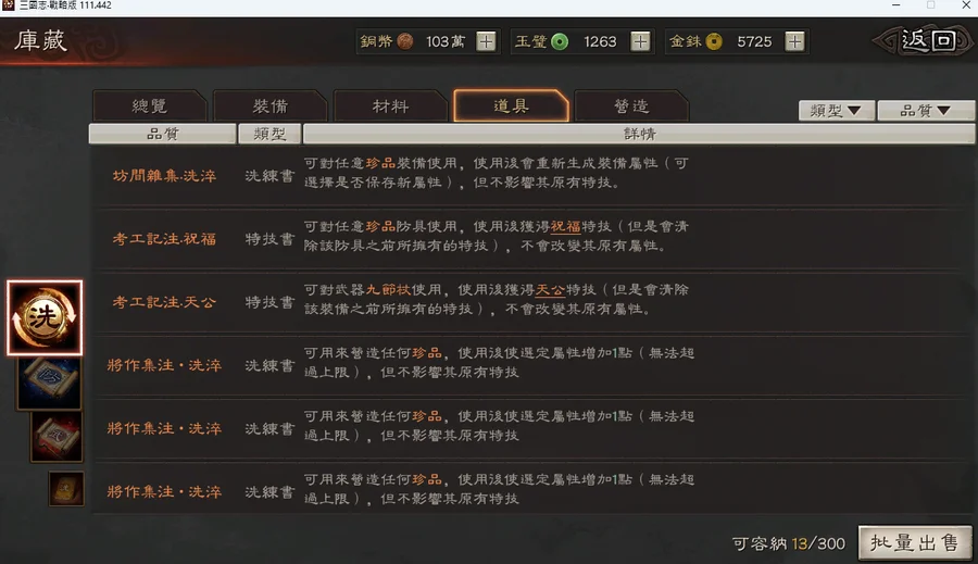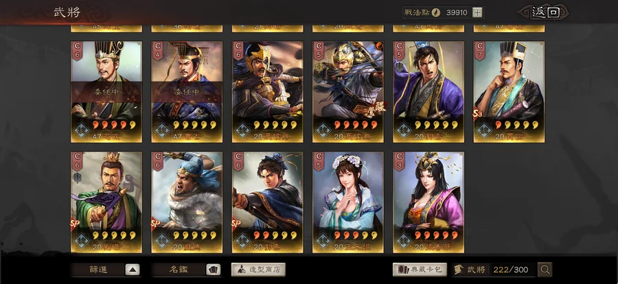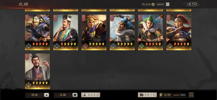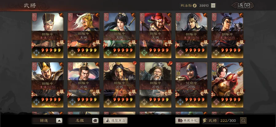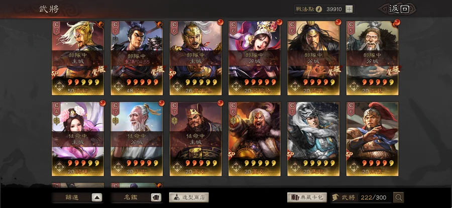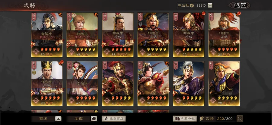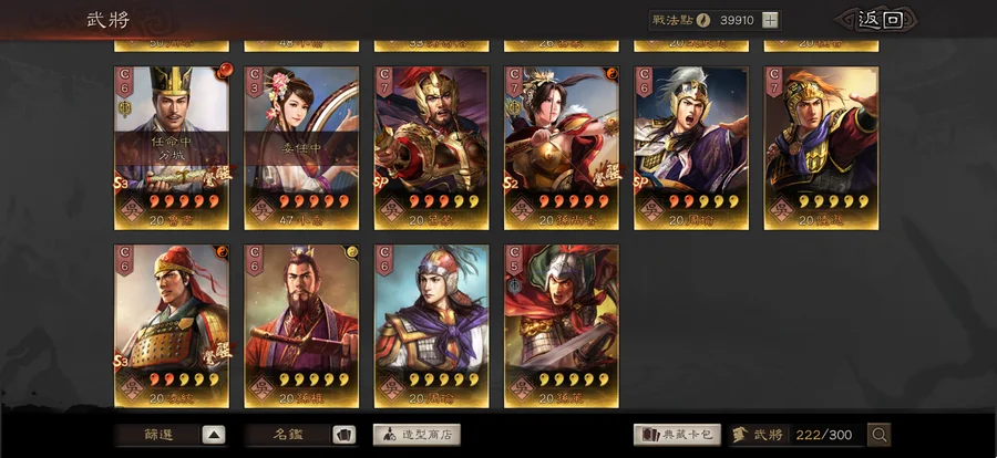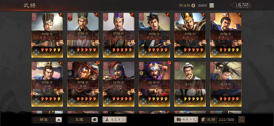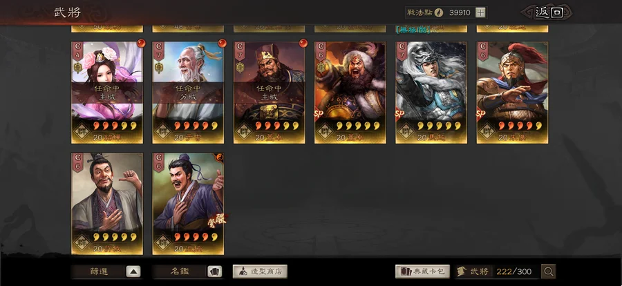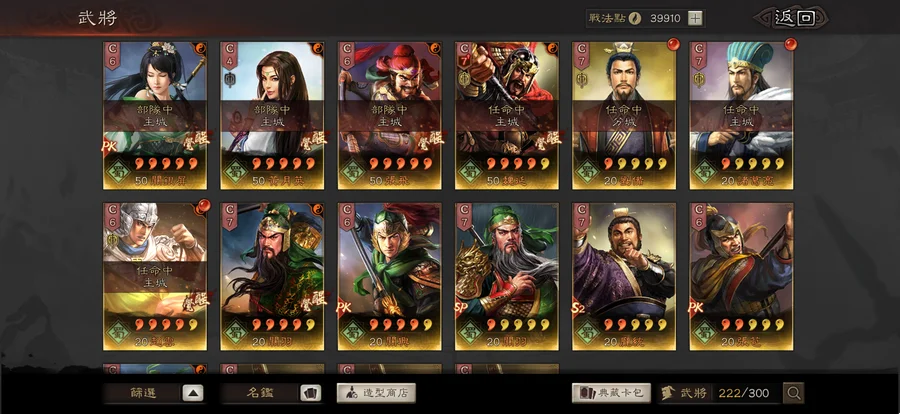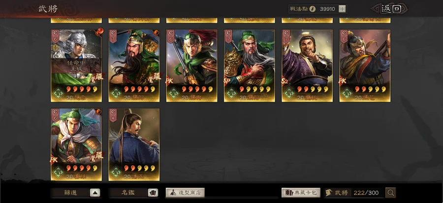 裝備:1精神 1衝陣 1踩踏 1援助 2護主 2暴躁 2好學 3靈動 武聖 雄烈 無雙 望族 天公書