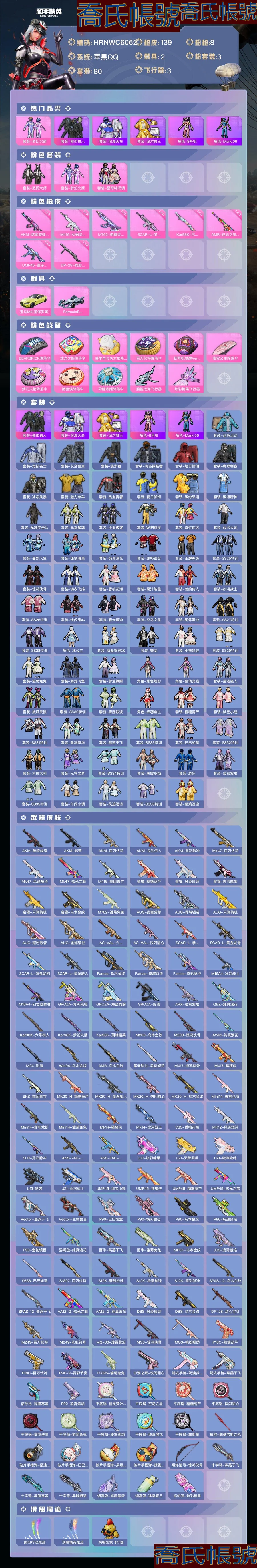 【OBHRNWC606242】熱力值:44260,3粉裝,8粉槍,2載具,11粉色戰備,80套裝,139槍械,171裝備,5滑翔尾翼,45降落傘;等級:Lv.57 歷史最高段位:絕世王牌21星 當前段位:不朽.星鑽Ⅳ;王牌印記8次 卓越印記3次 傳奇印記2次 絕世印記2次; 【熱門品類】:套裝-都市獵人,套裝-浪漫天命,套裝-派對舞王,角色-8號機,角色-Mark.06;【粉色套裝】:粉裝-數碼大師,粉裝-夢幻火箭,粉裝-星穹詠嘆調;【粉色槍械】:AKM-炫紫旋律[5級],M416-女媧靈識[3級],M762-電糖天使[5級],SCAR-L-夢幻火箭[6級],Kar98K-巳巳如意[5級],AMR-炫光之旅[3級],UMP45-量子極限[5級],DP-28-豹影疾電[5級];【粉色載具】:寶馬M4(聖保羅黃),FormulaEGen2(巔峰蘭);【粉色滑翔尾翼】:脆鯊七海飛行器,炫彩糖果飛行器;【粉色降落傘】:BEARBRICK降落傘,炫光之旅降落傘,喜羊羊與灰太狼降落傘,百萬伏特降落傘,初號機覺醒Ver.降落傘,臨安公主降落傘,夢幻火箭降落傘,豬豬俠降落傘,異瞳寒姬降落傘;【其他套裝】:套裝-藍色運動,套裝-競技名士,套裝-長空猛禽,套裝-漫步者,套裝-海島探路者,套裝-旭日情侶,套裝-鷹眼刺客,套裝-冰凍風暴,套裝-魅力單車,套裝-熱血青春,套裝-夏日傾情,套裝-繽紛果語,套裝-濱海廚神,套裝-龍魂突擊隊,套裝-元素星魂,套裝-冷血極客,套裝-WiFi精靈,套裝-霓虹街區,套裝-戰術大師,套裝-曼妙人魚,套裝-熱情海星,套裝-純真浪花,套裝-緋格組合,套裝-王牌教練,套裝-SS25特訓,套裝-驚鴻俠骨,套裝-錦衣飛揚,套裝-香桃花海,套裝-果汁能量,套裝-龍的傳人,套裝-冰河戰士,套裝-SS26特訓,套裝-快閃甜心,套裝-春光漫遊,套裝-空島之星,套裝-明鴛聖池,套裝-SS27特訓,套裝-SS28特訓,角色-冰公主,套裝-海鹽綿綿冰,套裝-蝶變,套裝-小熊娃娃,套裝-SS29特訓,套裝-雛菊兔兔,套裝-遊龍飛魚,套裝-蘿蘭蝴蝶,角色-緋色魅影,角色-紫俏靈貓,套裝-星途旅人,套裝-旋風靈鼠,套裝-SS30特訓,套裝-青團波波,角色-絳羽幽主,套裝-糖糖葫蘆,套裝-絨寶小鵝,套裝-SS31特訓,套裝-魚淵荷華,套裝-燕燕於飛,套裝-SS33特訓,套裝-巳巳如意,套裝-SS32特訓,套裝-大橘大利,套裝-元氣之夢,套裝-SS34特訓,套裝-朱霞熾焰,套裝-遊樂,套裝-凌霄紫焰,套裝-SS35特訓,套裝-午間小調,套裝-風跡短詩,套裝-SS36特訓,套裝-萌雞速遞;其他槍械:AKM-破曉戰魂,AKM-影襲,AKM-百萬伏特,AKM-龍的傳人,AKM-霓彩脈衝,Mk47-百萬伏特,Mk47-風跡短詩,Mk47-炫光之旅,M416-糯團青竹,蜜獾-糖糖葫蘆,蜜獾-風跡短詩,蜜獾-緋穹魔姬,蜜獾-天降萌嘰,蜜獾-烏木金紋,M762-雛菊兔兔,AUG-甜蜜菠蘿,AUG-異域銀裝,AUG-天降萌嘰,AUG-耀粉歌者,AUG-金蛇鎮世,AC-VAL-六號稻草人,AC-VAL-快閃甜心,SCAR-L-拳皇狂花道,SCAR-L-黃金龍骨,SCAR-L-海鹽豹豹,SCAR-L-星途旅人,Famas-烏木金紋,Famas-鏡域雙華,Famas-霓彩脈衝,M16A4-冰河戰士,M16A4-幻世戰舞者,GROZA-異彩先驅,GROZA-海鹽豹豹,GROZA-影襲,ARX-凌霄紫焰,QBZ-純真浪花,Kar98K-六號樹人,Kar98K-夢幻火箭,Kar98K-頂峰精英,M200-烏木金紋,M200-驚鴻俠骨,AWM-純真浪花,M24-影襲,Win94-烏木金紋,AMR-烏木金紋,莫辛納甘-風跡短詩,M417-驚鴻俠骨,M417-豬豬俠,SKS-糯團青竹,MK20-H-糖糖葫蘆,MK20-H-星途旅人,MK20-H-快閃甜心,MK20-H-烏木金紋,Mini14-香桃花海,Mini14-穿刺龍蝦,Mini14-雛菊兔兔,Mk14-豬豬俠,Mk14-冰河戰士,VSS-香桃花海,MK12-風跡短詩,SLR-霓彩脈衝,AKS-74U-烏木金紋,AKS-74U-雞智如我,UZI-炫彩糖果,UZI-天降萌嘰,UZI-啾咪啾咪,UZI-影襲,UZI-冰河戰士,UMP45-絨寶小鵝,UMP45-豬豬俠,UMP45-糖糖葫蘆,UMP45-炫光之旅,Vector-燕燕於飛,Vector-生命誓言,P90-巳巳如意,P90-快閃甜心,P90-烏木金紋,P90-玩趣呆呆,P90-金蛇鎮世,湯姆遜-純真浪花,野牛-燕燕於飛,野牛-雛菊兔兔,MP5K-烏木金紋,JS9-凌霄紫焰,S686-巳巳如意,S1897-百萬伏特,S12K-破曉戰魂,S12K-極意拳鋒,S12K-霓彩脈衝,SPAS-12-烏木金紋,SPAS-12-燕燕於飛,AA12-G-炫光之旅,AA12-G-純真浪花,DBS-風跡短詩,DBS-烏木金紋,DP-28-甜心寶貝,M249-百萬伏特,M249-彩虹符號,MG-36-凌霄紫焰,MG3-驚鴻俠骨,MG3-桃粉嫣然,P18C-糖糖葫蘆,P18C-百萬伏特,TMP-9-霓彩節奏,R1895-雛菊兔兔,沙漠之鷹-快閃甜心,蠍式手槍-奶油夢幻熊,蠍式手槍-燕燕於飛,信號槍-異瞳寒姬,P92-凌霄紫焰,平底鍋-精靈夢葉羅麗,平底鍋-空島之星,平底鍋-糖糖葫蘆,平底鍋-快閃甜心,平底鍋-驚鴻俠骨,平底鍋-雛菊兔兔,平底鍋-凌霄紫焰,平底鍋-純真浪花,平底鍋-超新星,撬棍-朗基努斯之槍,破片手榴彈-星途旅人,破片手榴彈-巳巳如意,破片手榴彈-呆爆全場,破片手榴彈-拽到爆炸,爆炸獵弓-驚鴻俠骨,十字弩-燕燕於飛,十字弩-異瞳寒姬,十字弩-異域銀裝,煙霧彈-鳶尾晶夢,煙霧彈-冰氧夏日,鋁熱彈-炫彩糖果;【其他滑翔尾翼】:破刃行動尾跡,頂峰精英尾跡,雞智如我飛行器;【其他降落傘】:天涯共此時降落傘,海鹽豹豹降落傘,和平使命降落傘,驚鴻俠骨降落傘,星途旅人降落傘,風跡短詩降落傘,SS31王牌降落傘,燕燕於飛降落傘,糖糖葫蘆降落傘,電競之星降落傘,快閃甜心降落傘,SS35王牌降落傘,幹得PEL亮降落傘,月下萌萌兔降落傘,幻世戰舞者降落傘,純真浪花降落傘,遊龍飛魚降落傘,化學天才降落傘,SS34王牌降落傘,SS30王牌降落傘,霓彩節奏降落傘,寂夜之火降落傘,冰河戰士降落傘,SS29王牌降落傘,普通降落傘,凌霄紫焰降落傘,魔童鬧海敖閏降落傘,鋼鐵雄心降落傘,雛菊兔兔降落傘,巳巳如意降落傘,都市獵人降落傘,放飛夢想降落傘,香桃花海降落傘,SS28王牌降落傘,夏日傾情降落傘,SS33王牌降落傘;【夥伴】:夥伴-啾啾,夥伴-雞哥,夥伴-盔