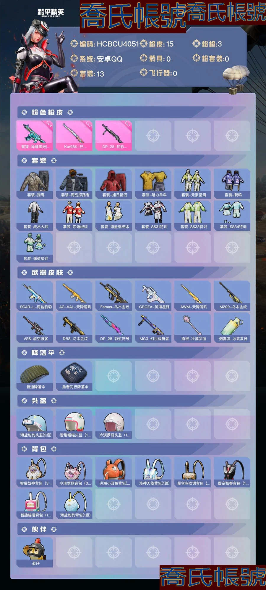 【OBHCBCU405142】熱力值:3914,3粉槍,13套裝,15槍械,12裝備,2降落傘;等級:Lv.23 歷史最高段位:堅韌鉑金Ⅲ 當前段位:英勇.黃金Ⅲ;;地鐵滿天賦; 【粉色槍械】:蜜獾-異瞳寒姬[4級],Kar98K-巳巳如意[2級],DP-28-豹影疾電[1級];【其他套裝】:套裝-獵鷹,套裝-海島探路者,套裝-旭日情侶,套裝-魅力單車,套裝-元素星魂,套裝-鶴鳴,套裝-戰術大師,套裝-戀語絨絨,套裝-海鹽綿綿冰,套裝-SS31特訓,套裝-SS33特訓,套裝-SS34特訓,套裝-薄荷星砂;其他槍械:SCAR-L-海鹽豹豹,AC-VAL-天降萌嘰,Famas-烏木金紋,GROZA-熒海星豚,AWM-天降萌嘰,M200-烏木金紋,VSS-虛空駭客,DBS-烏木金紋,DP-28-彩虹符號,MG3-幻世戰舞者,撬棍-冷漠羅麗,煙霧彈-冰氧夏日;【其他降落傘】:普通降落傘,勇者同行降落傘;【夥伴】:夥伴-盔仔,【實際資訊請以最終驗號結果為準】