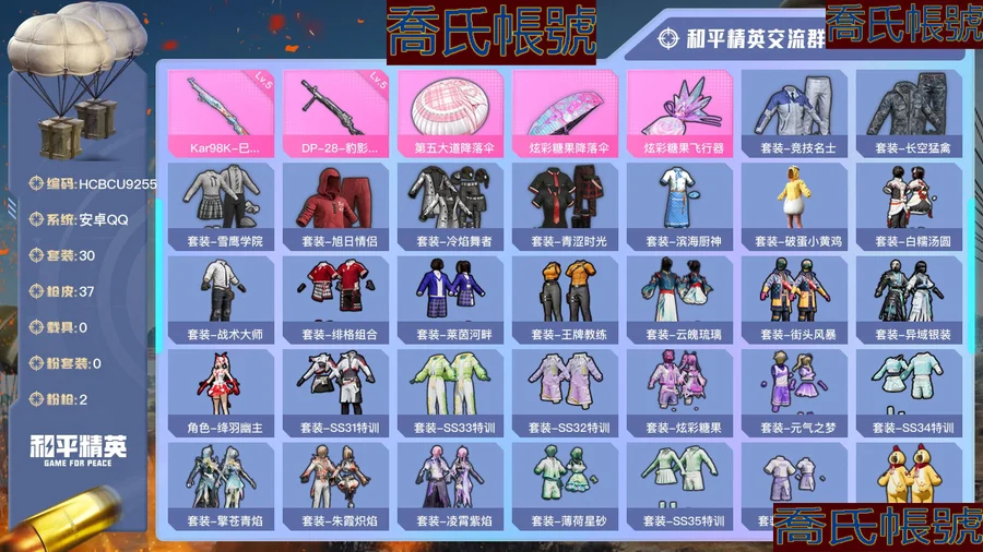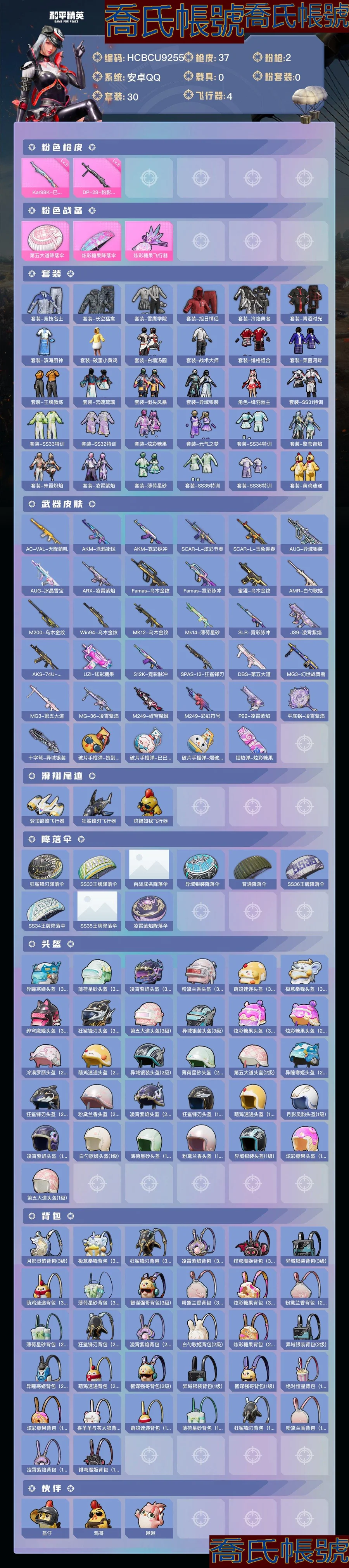 【OBHCBCU925542】熱力值:12274,2粉槍,3粉色戰備,30套裝,37槍械,68裝備,4滑翔尾翼,11降落傘;等級:Lv.43 歷史最高段位:超級王牌16星 當前段位:超級.王牌1星;王牌印記4次 卓越印記1次; 【粉色槍械】:Kar98K-巳巳如意[5級],DP-28-豹影疾電[5級];【粉色滑翔尾翼】:炫彩糖果飛行器;【粉色降落傘】:第五大道降落傘,炫彩糖果降落傘;【其他套裝】:套裝-競技名士,套裝-長空猛禽,套裝-雪鷹學院,套裝-旭日情侶,套裝-冷焰舞者,套裝-青澀時光,套裝-濱海廚神,套裝-破蛋小黃雞,套裝-白糯湯圓,套裝-戰術大師,套裝-緋格組合,套裝-萊茵河畔,套裝-王牌教練,套裝-雲魄琉璃,套裝-街頭風暴,套裝-異域銀裝,角色-絳羽幽主,套裝-SS31特訓,套裝-SS33特訓,套裝-SS32特訓,套裝-炫彩糖果,套裝-元氣之夢,套裝-SS34特訓,套裝-擎蒼青焰,套裝-朱霞熾焰,套裝-凌霄紫焰,套裝-薄荷星砂,套裝-SS35特訓,套裝-SS36特訓,套裝-萌雞速遞;其他槍械:AC-VAL-天降萌嘰,AKM-塗鴉街區,AKM-霓彩脈衝,SCAR-L-炫彩節奏,SCAR-L-玉兔迎春,AUG-異域銀裝,AUG-冰晶雪寶,ARX-凌霄紫焰,Famas-烏木金紋,Famas-霓彩脈衝,蜜獾-烏木金紋,AMR-白勺歌姬,M200-烏木金紋,Win94-烏木金紋,MK12-烏木金紋,Mk14-薄荷星砂,SLR-霓彩脈衝,JS9-凌霄紫焰,AKS-74U-烏木金紋,UZI-炫彩糖果,S12K-霓彩脈衝,SPAS-12-狂鯊鋒刃,DBS-第五大道,MG3-幻世戰舞者,MG3-第五大道,MG-36-凌霄紫焰,M249-緋穹魔姬,M249-彩虹符號,P92-凌霄紫焰,平底鍋-凌霄紫焰,十字弩-異域銀裝,破片手榴彈-拽到爆炸,破片手榴彈-巳巳如意,破片手榴彈-爆破雪人,鋁熱彈-炫彩糖果;【其他滑翔尾翼】:登頂巔峰飛行器,狂鯊鋒刃飛行器,雞智如我飛行器;【其他降落傘】:狂鯊鋒刃降落傘,SS33王牌降落傘,百戰成名降落傘,異域銀裝降落傘,普通降落傘,SS36王牌降落傘,SS34王牌降落傘,SS35王牌降落傘,凌霄紫焰降落傘;【夥伴】:夥伴-盔仔,夥伴-雞哥,夥伴-啾啾,【實際資訊請以最終驗號結果為準】